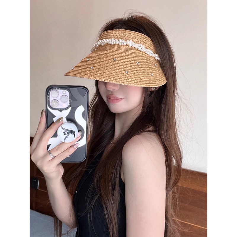 新款 出游海边度假防晒帽 名媛风细草编空顶帽女珍珠带钻遮阳帽夏季