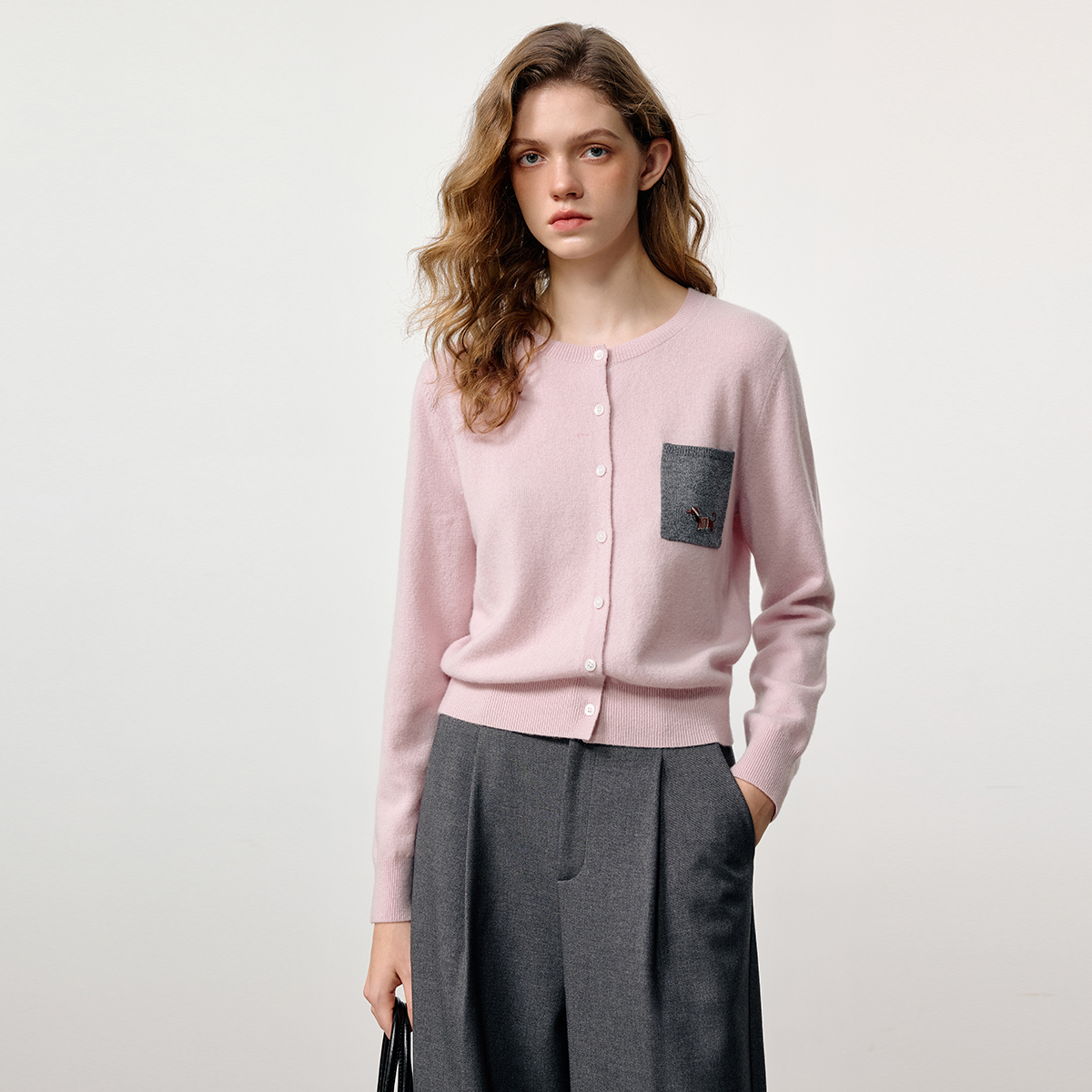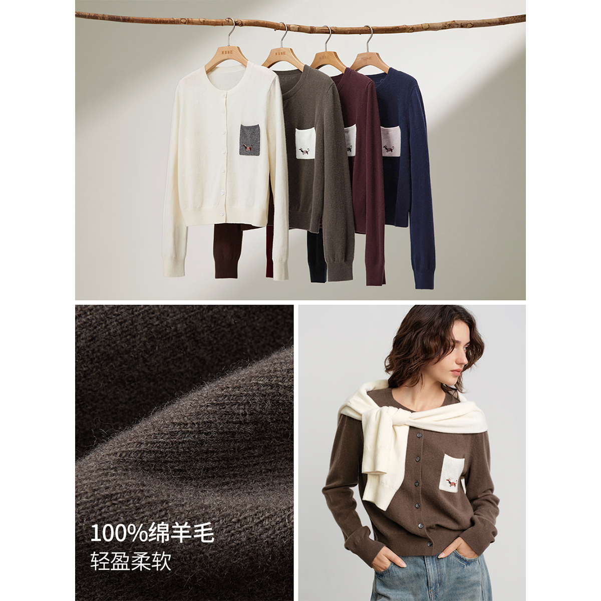 100%绵羊毛 长袖 KBNE白色针织外搭开衫 新款 针织上衣 女2025秋季