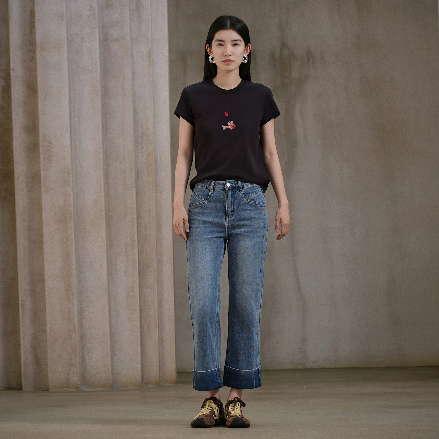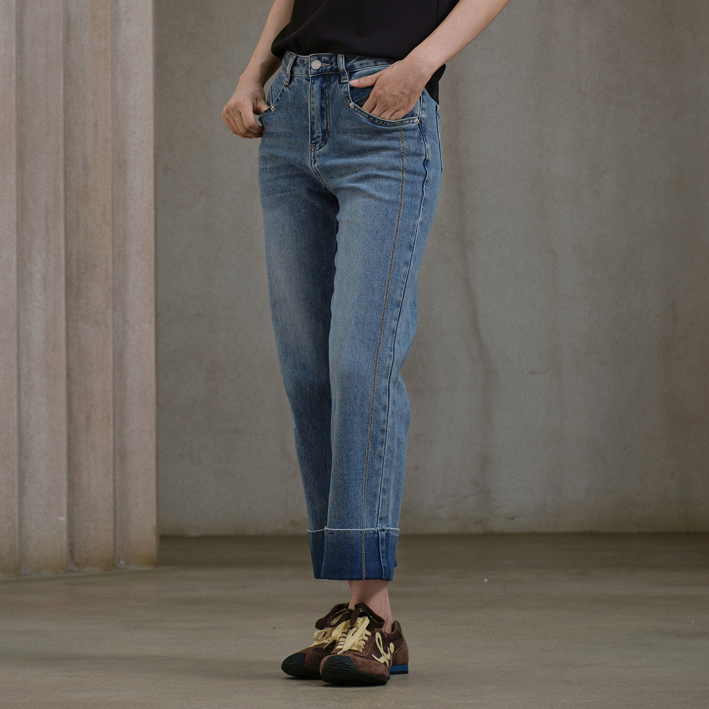 女 做旧复古皮牌斜插高腰松弛显瘦宽松直筒牛仔裤 ONLY2025秋季 新款