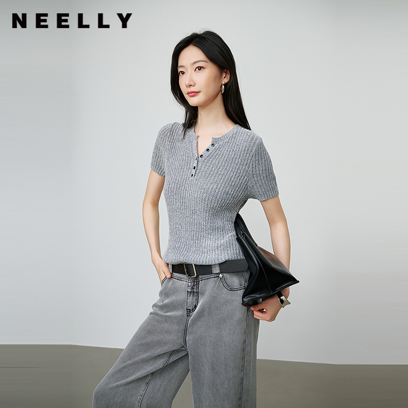 秋季 显瘦短款 新款 女修身 上衣 简约气质针织短袖 NEELLY纳俪商场同款