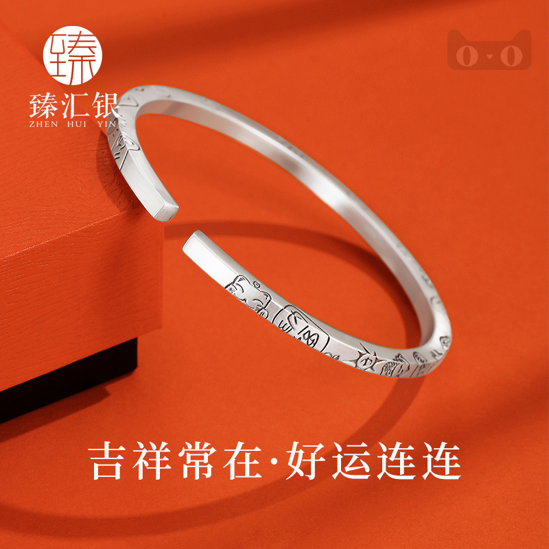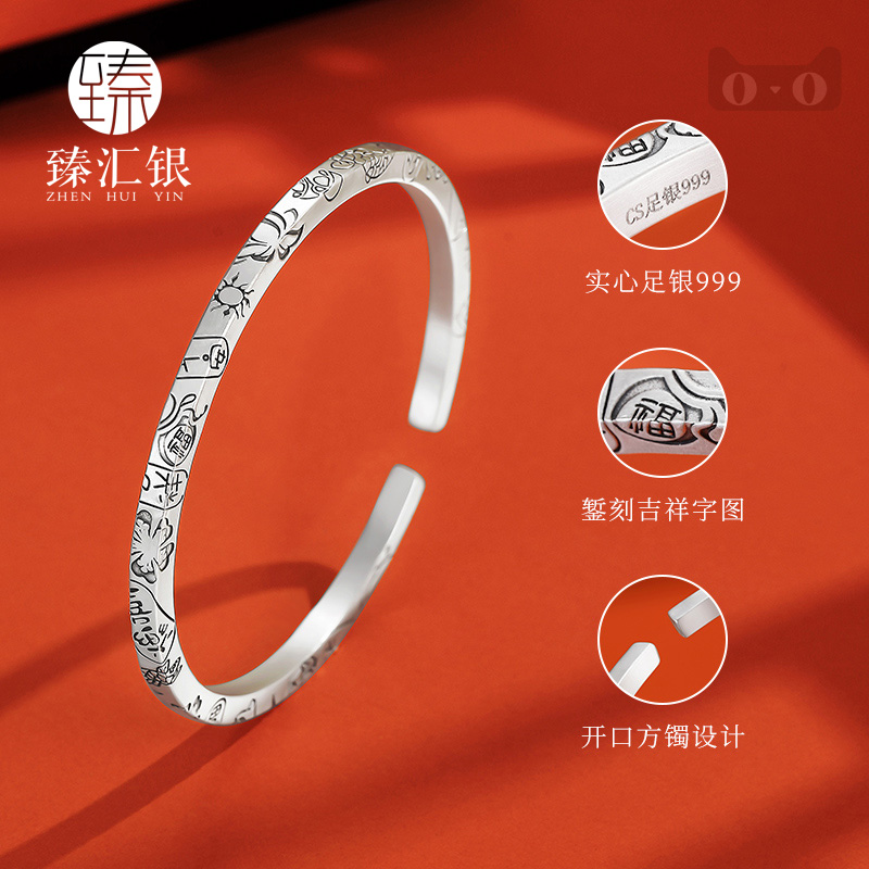 周六福古法手镯女实心S999足银素圈沙面三生三世节日礼物送女友