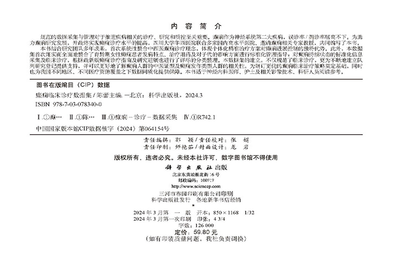 包邮 社 癫痫临床诊疗数据集 科学出版 9787030783400 陈蕾编著 现货