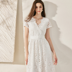 歌莉娅连衣裙女2025新款 重要场合蕾丝绣花白色裙子1E4R4K39A 夏季