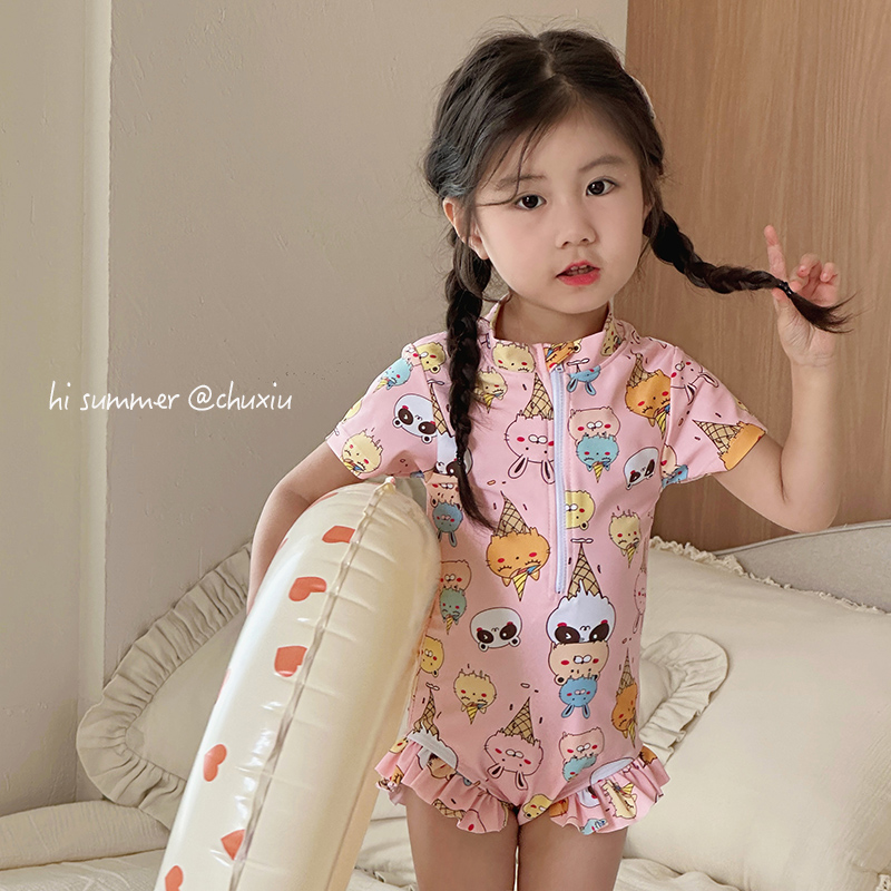 夏季 宝宝中小童度假游泳衣 女童游泳衣女孩连体印花卡通速干短袖