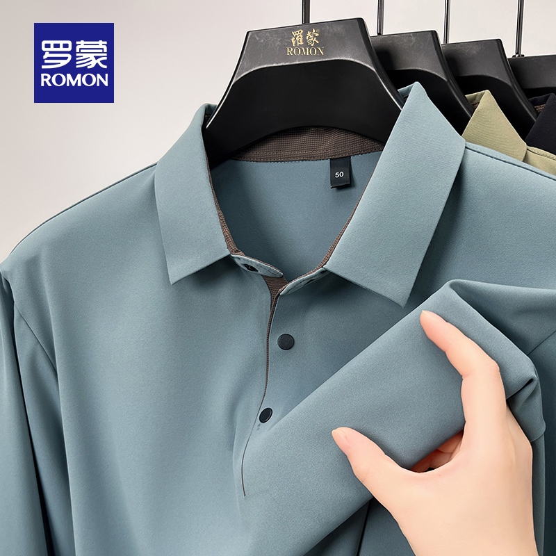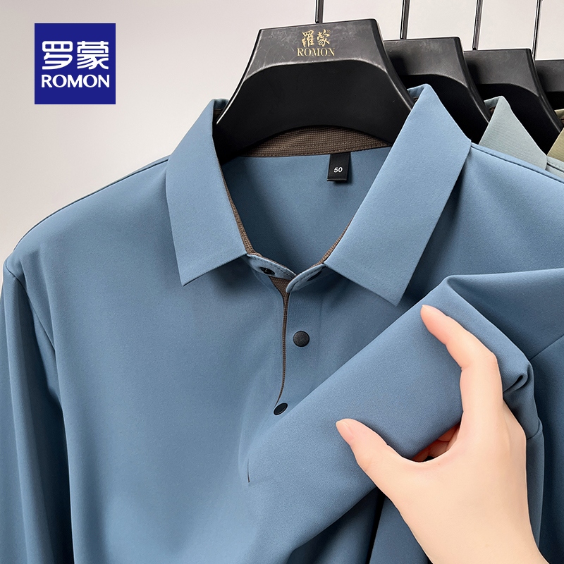新款 体恤胖子宽松免烫抗皱POLO衫 大码 无感空气格翻领长袖 男士 秋季