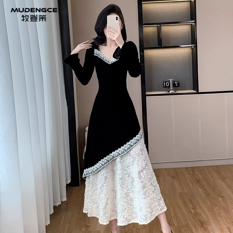 裙子 洋气收腰显瘦中长款 加绒加厚假两件连衣裙女2025秋冬新款 时尚