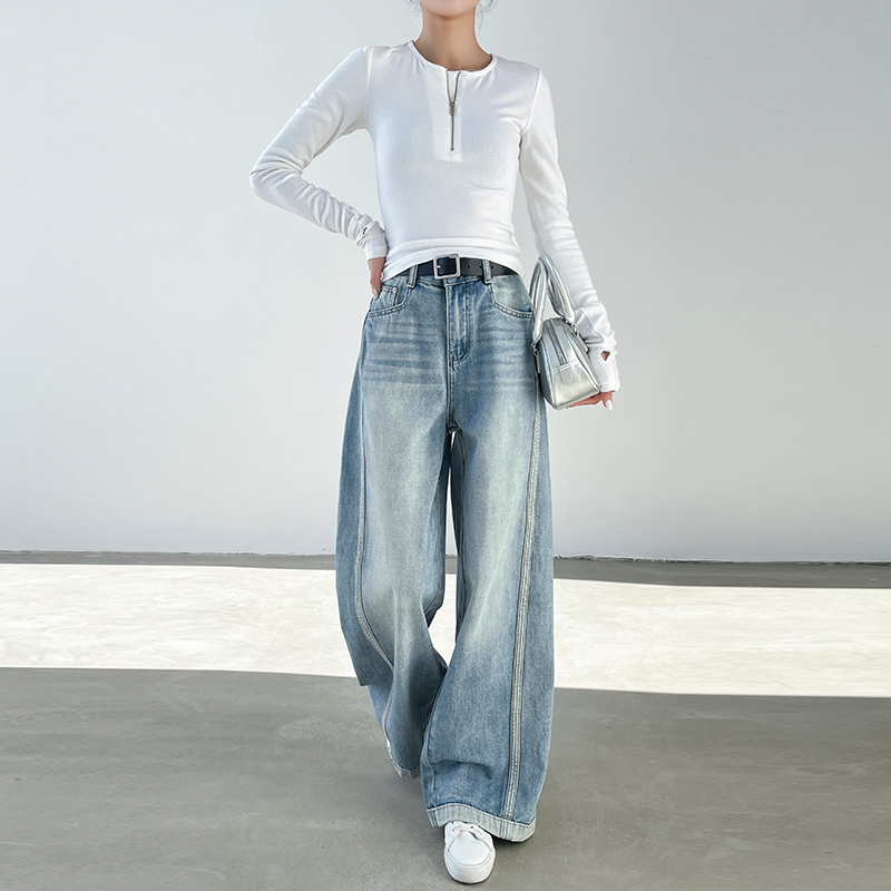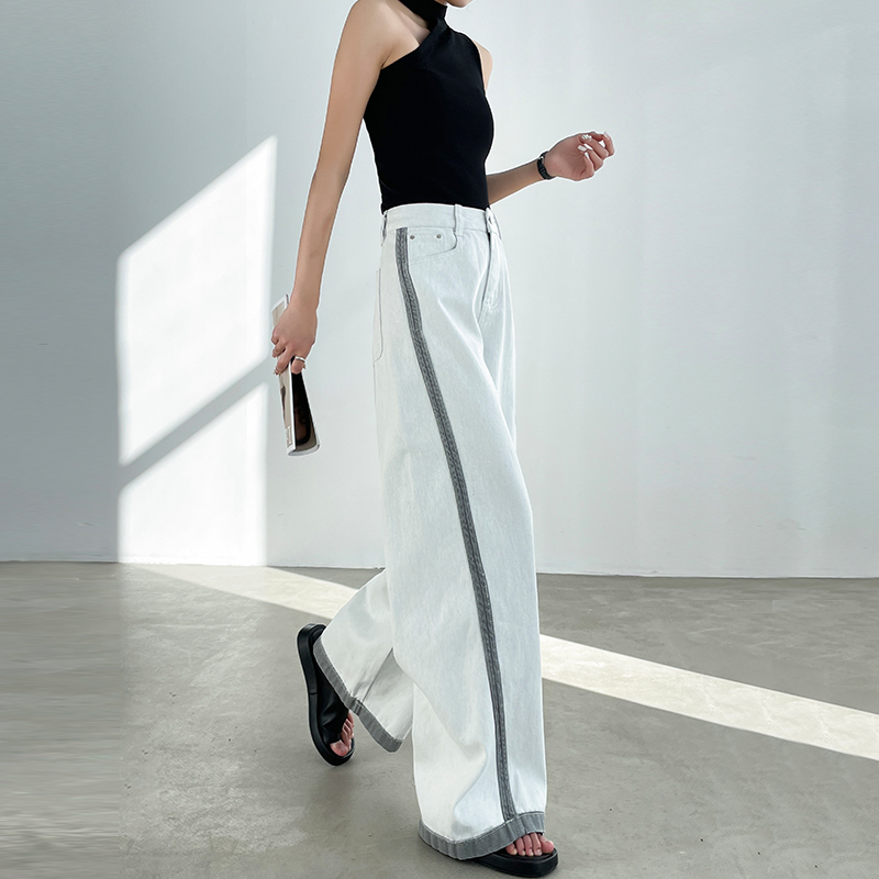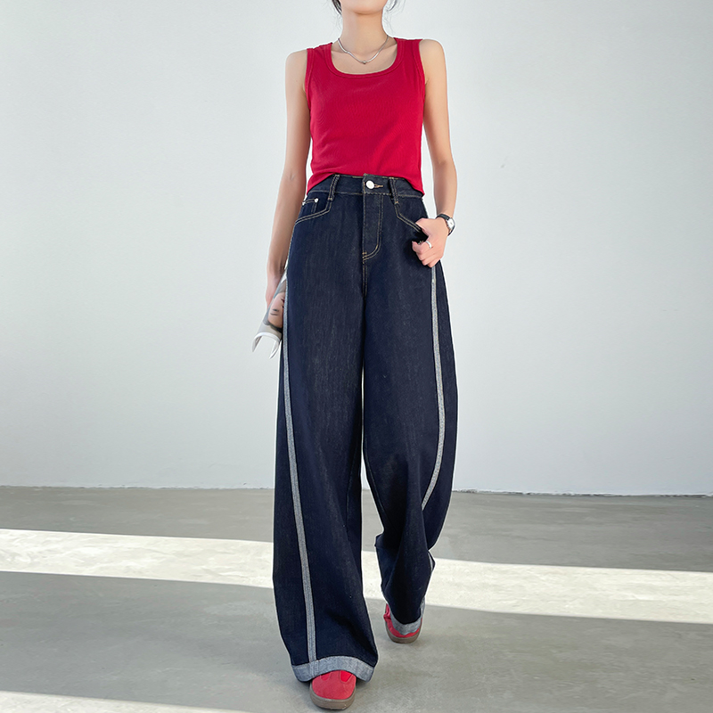 高腰宽松显瘦直筒拖地裤 新款 子 女春季 普鲁士蓝撞色拼接阔腿牛仔裤