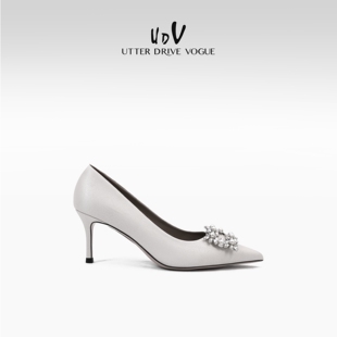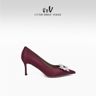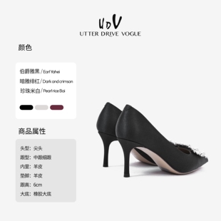 黑色高跟鞋 拉丝牛皮单鞋 女2025春季 细跟花钻尖头婚鞋 新款 UDV法式