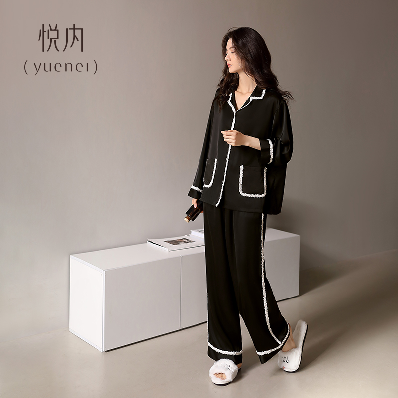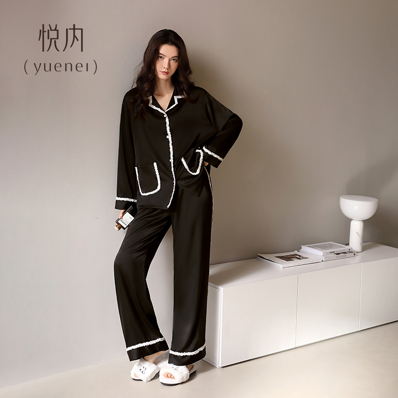 家居服夏季 冰丝薄款 仿真丝绸黑色轻奢高级感 长袖 悦内睡衣女春秋款