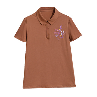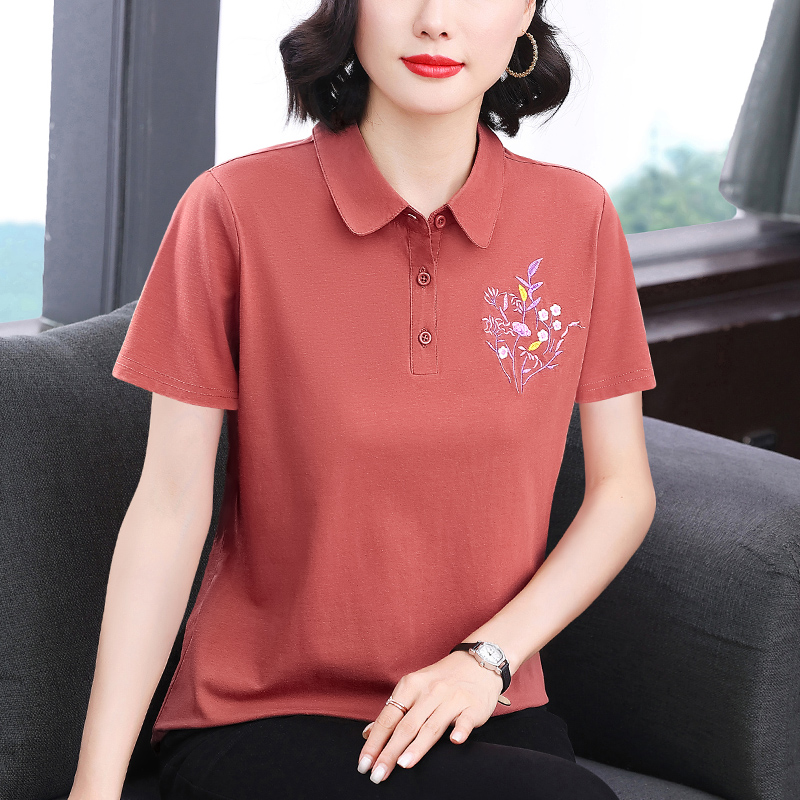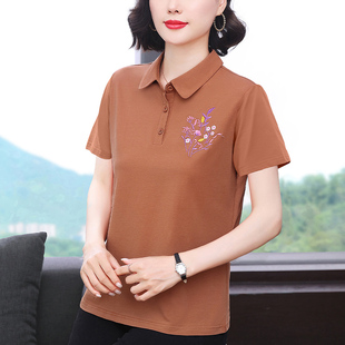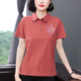 宽松洋气上衣POLO衫 妈妈翻领刺绣纯棉短袖 中年女装 夏季 T恤杉新款