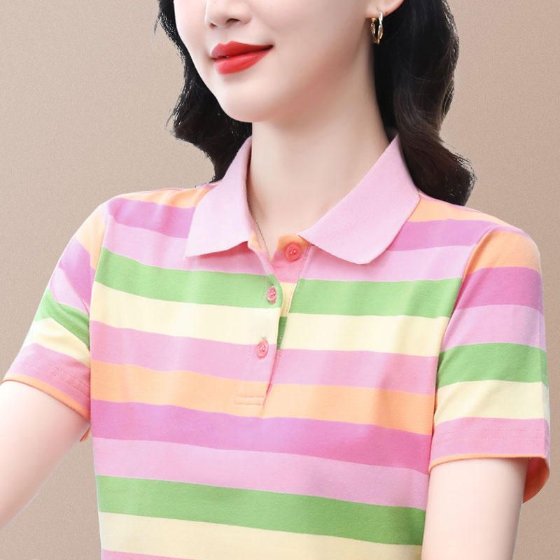 t恤女彩虹条纹2025年新款 上衣运动polo衫 夏季 妈妈装 大码 纯棉短袖
