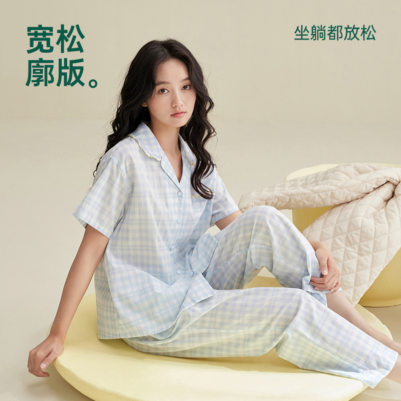 纯棉家居服夏款 睡衣女夏季 甜美格子休闲可外穿 梭织棉布 安之伴