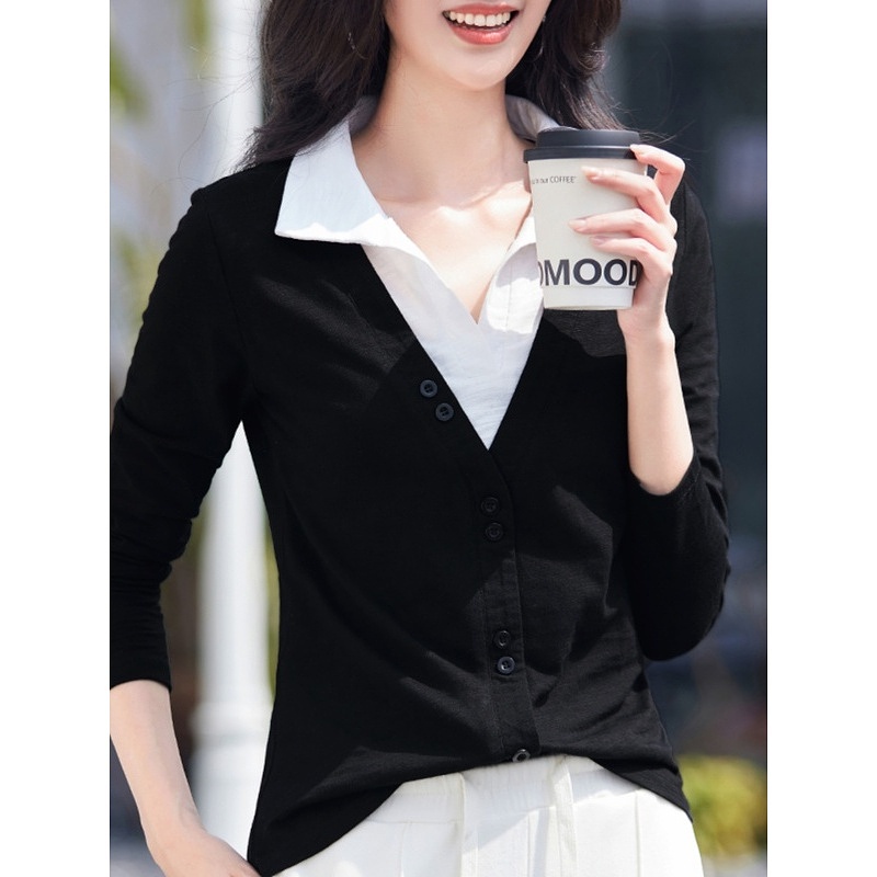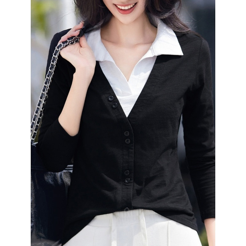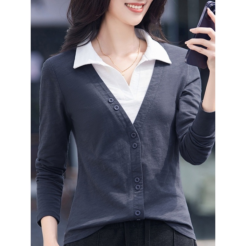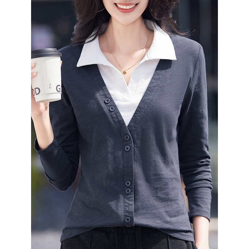 纽扣拼色假两件休闲纯棉打底上衣 新款 POLO领长袖 T恤女2025年春季