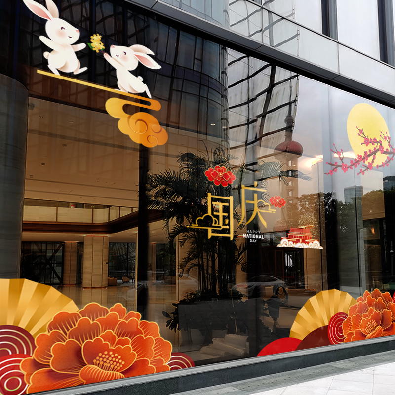 中秋国庆节装 饰窗贴玻璃门贴纸店铺橱窗卡通窗花店面布置贴画墙贴