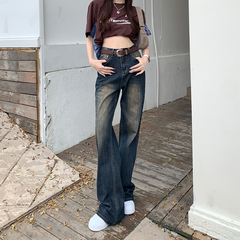 高腰宽松休闲长裤 阔色深蓝色阔腿直筒牛仔裤 美式 新款 女2025秋冬季