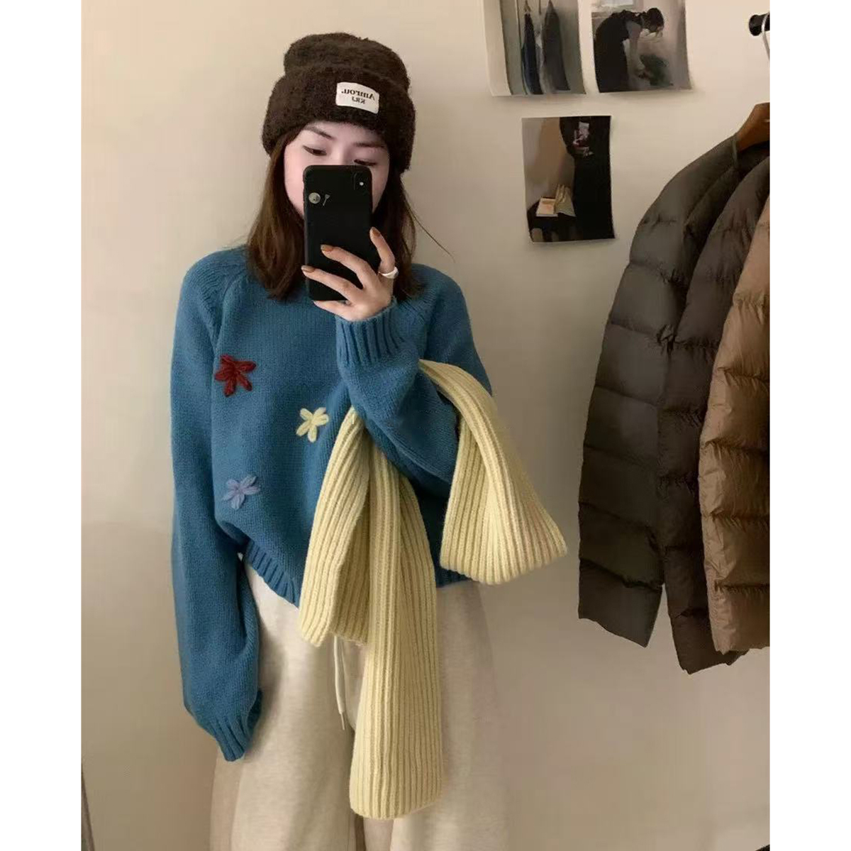圆领毛衣女冬季 打底内搭上衣 宽松温柔风设计感绣花软糯加厚针织衫
