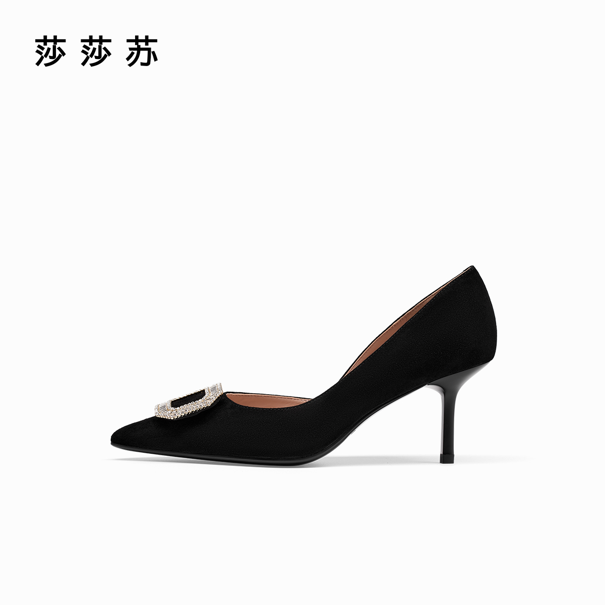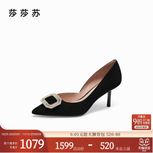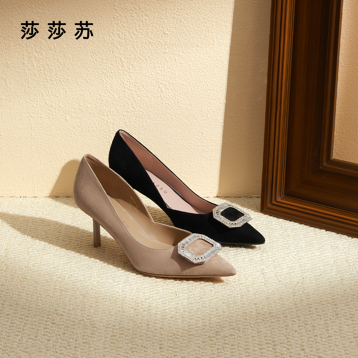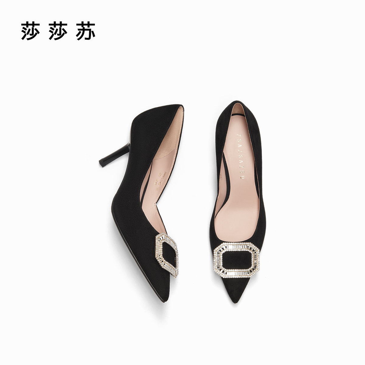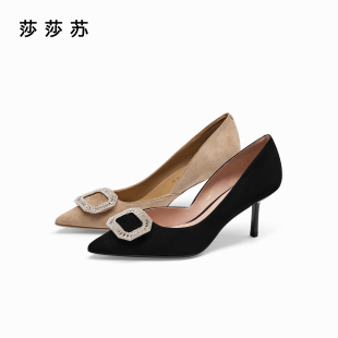 方扣水钻尖头高跟鞋 莎莎苏2025春新款 女羊绒面宴会单鞋 克拉恋人