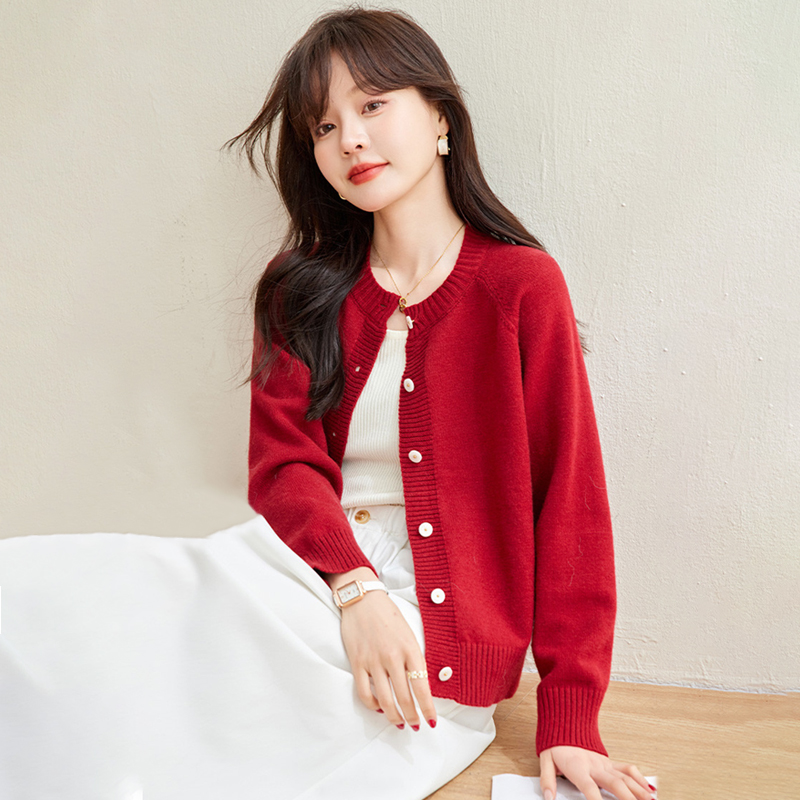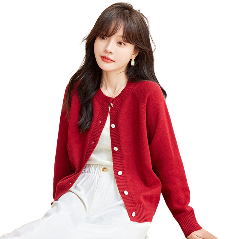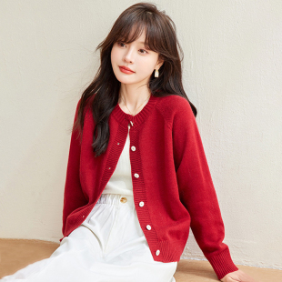 本命年红色小香风气质圆领百搭上衣外套 款 NG真维斯针织开衫 女春季