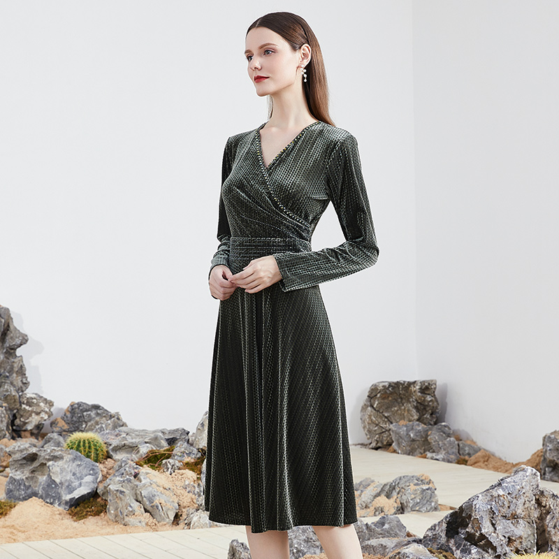 马天奴女装 绿色V领丝绒连衣裙子收腰钉珠长裙复古气质 秋冬新款