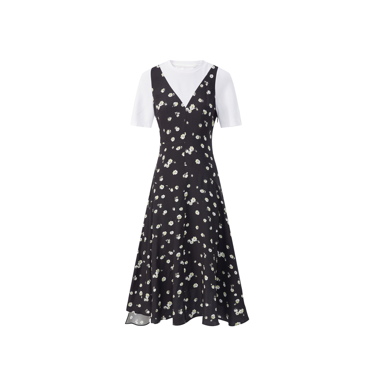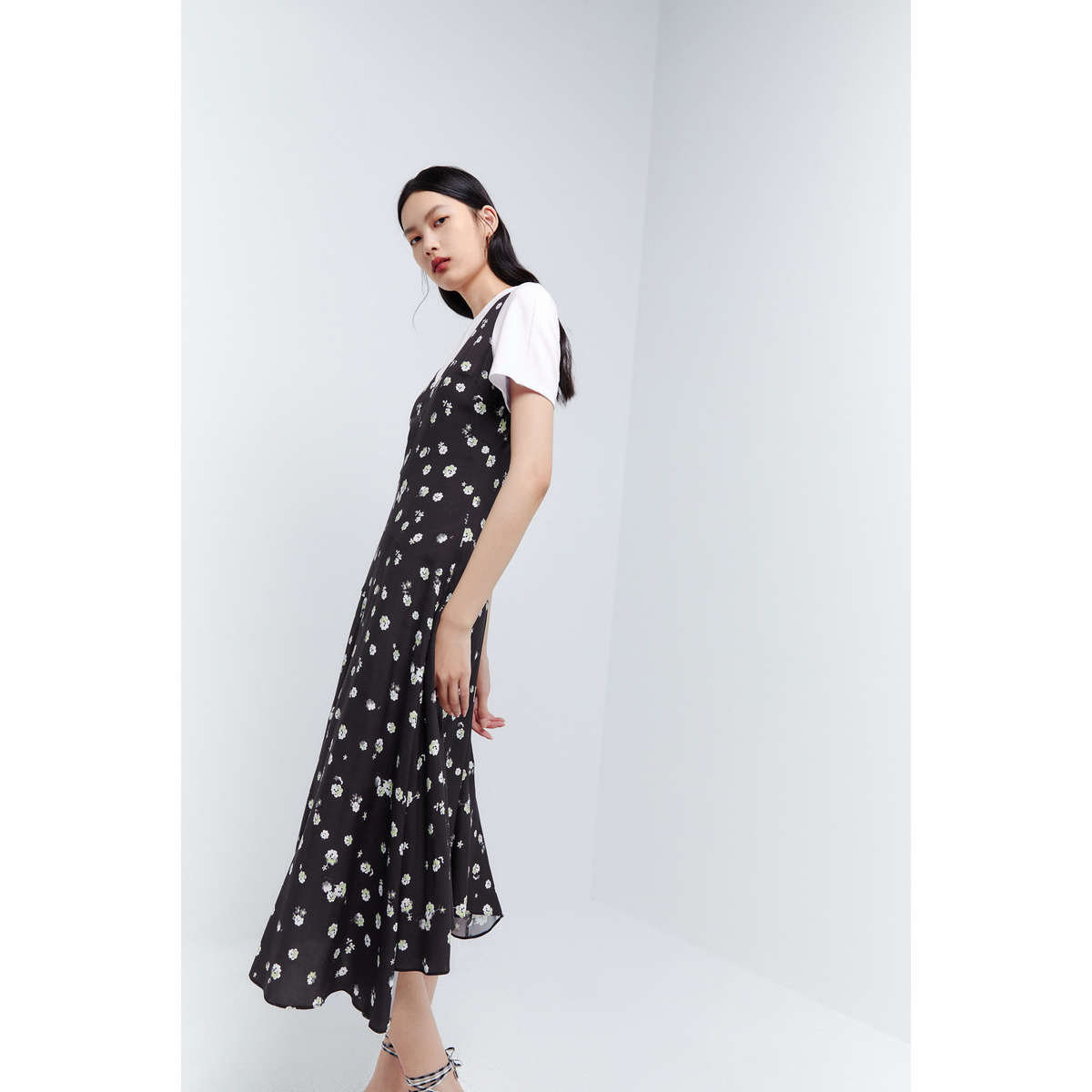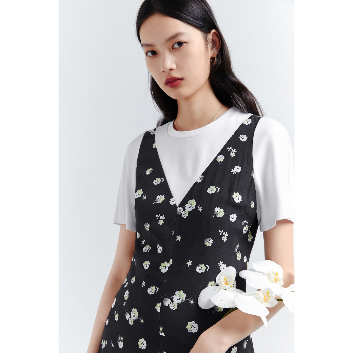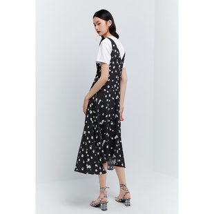 年夏季 太平鸟 假两件拼接连衣裙印花V领高腰气质长裙 清仓