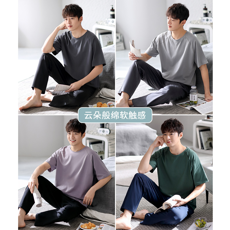夏季 纯棉短袖 薄款 莱卡棉 套装 夏天夏款 睡衣男士 家居服男款 长裤