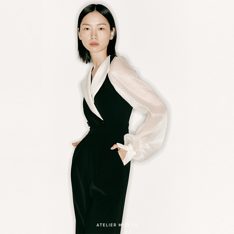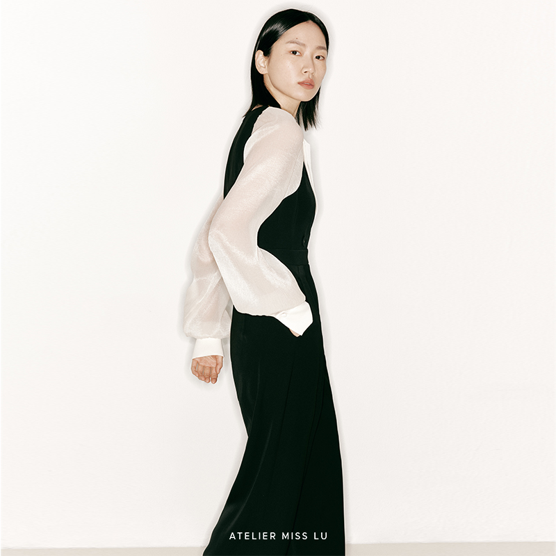 AtelierMissLu翻领拼纱长袖 气质通勤收腰连体裤