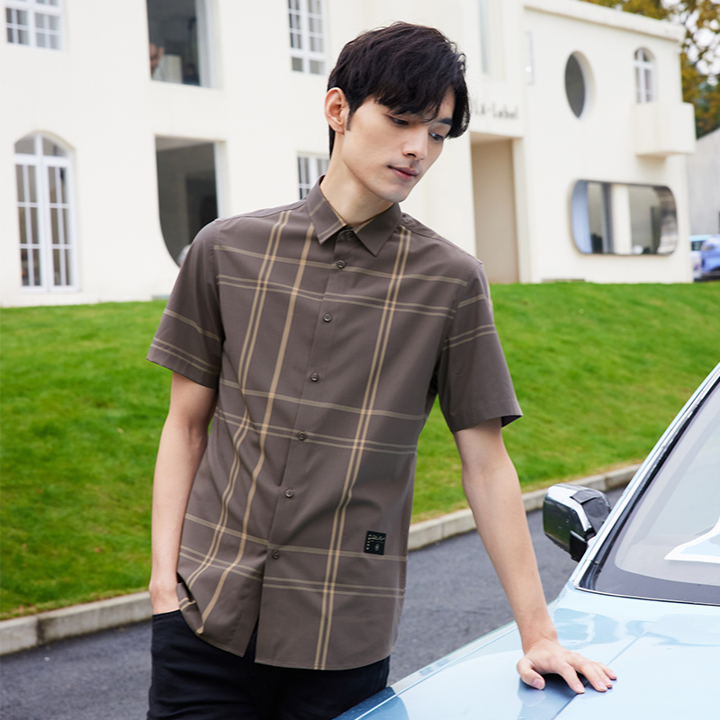 休闲短袖 才子男装 衬衫 男2024夏季 格子冰丝衬衣 修身 液氨工艺