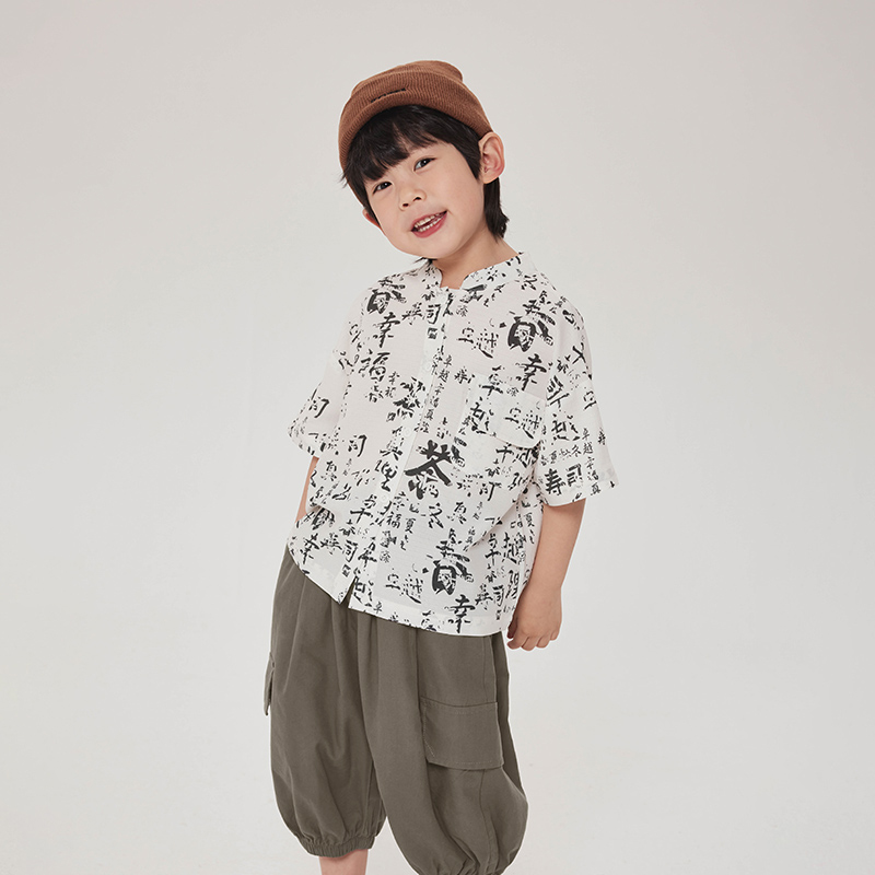 2025夏装 短袖 新款 儿童国风新中式 上衣 积木城堡 衬衣薄款 男童衬衫