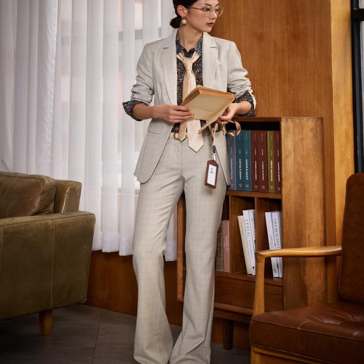 格子秋季 套装 新款 高级感一粒扣小西装 两件套 职业工装 灰色长裤 女裤