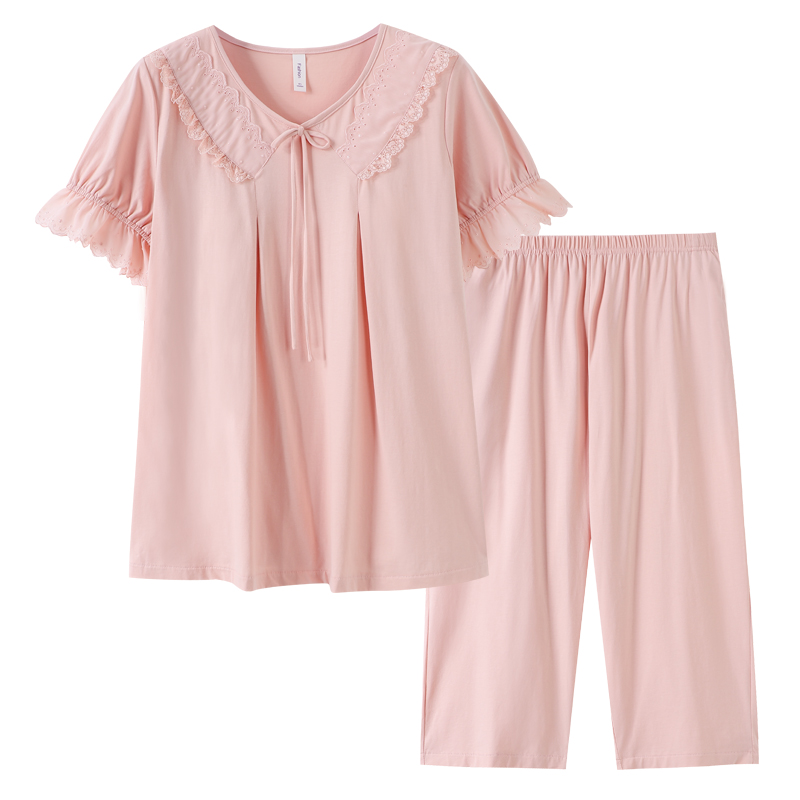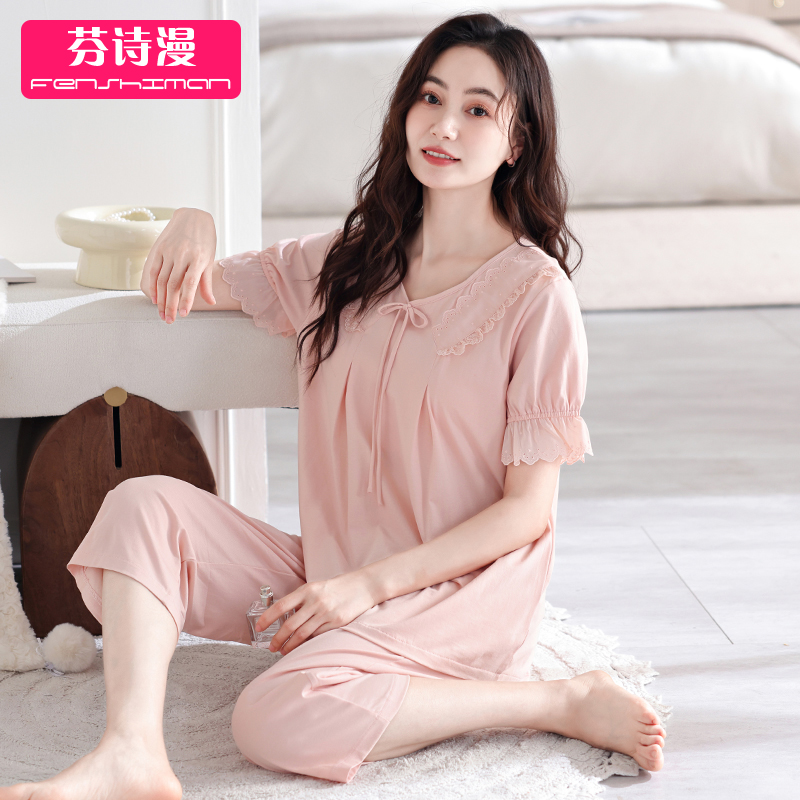 纯棉短袖 家居服套装 七分裤 妈妈夏天女式 2025新款 带胸垫睡衣女夏季