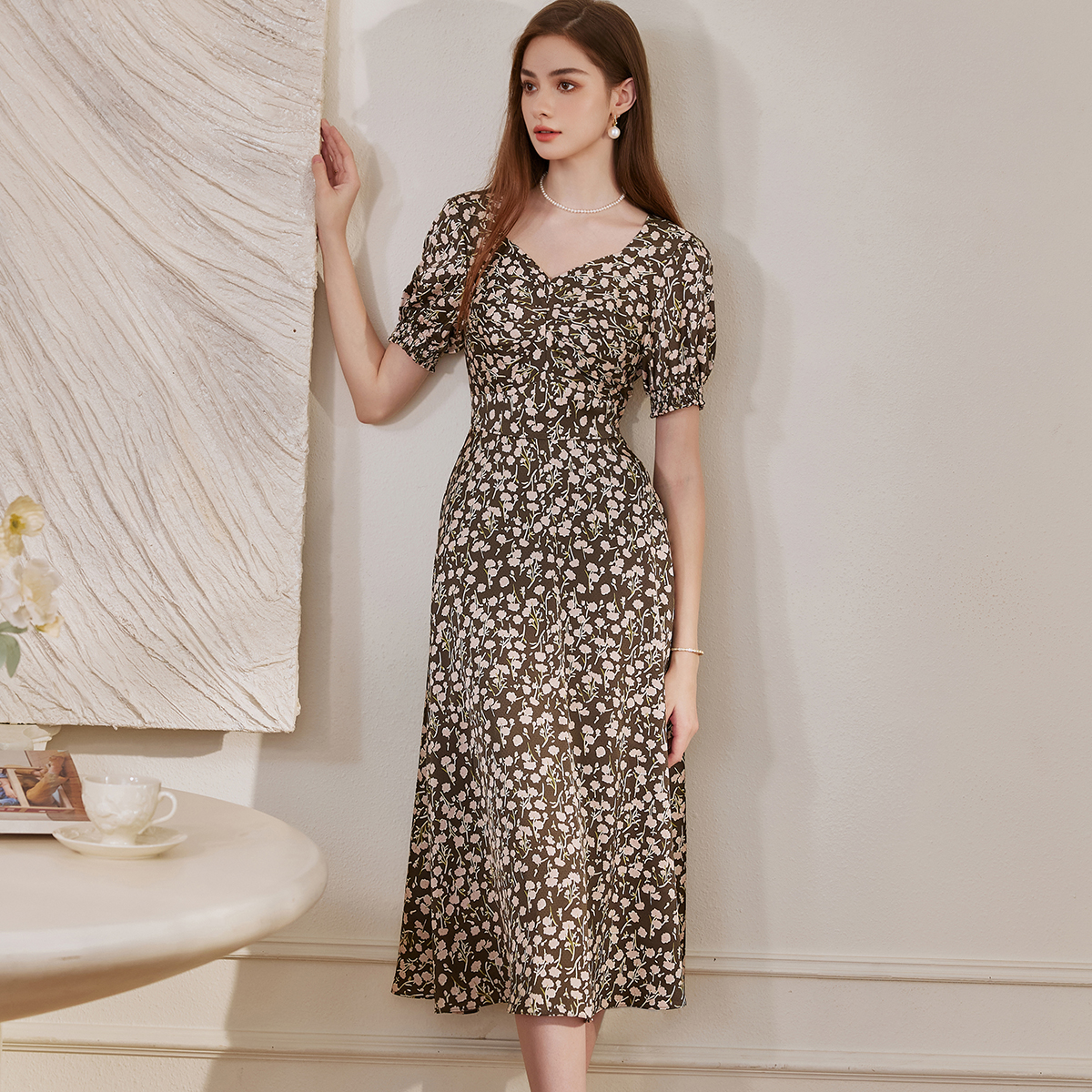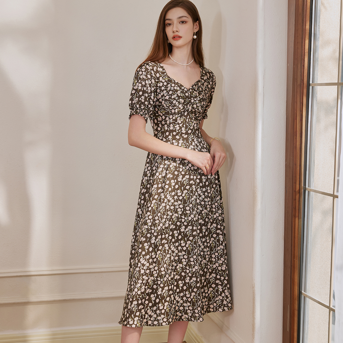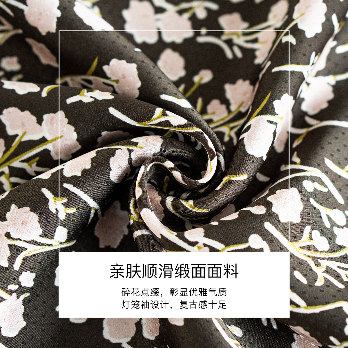 气质碎花中长裙10322 灯笼袖 罗衣茶歇法式 缎面连衣裙2024初夏新款