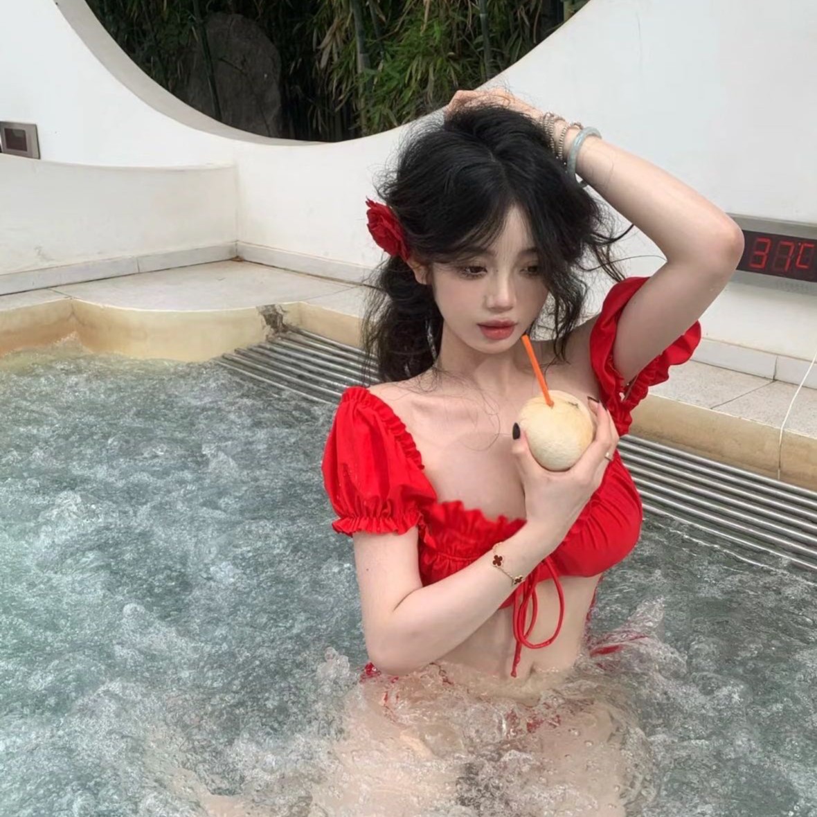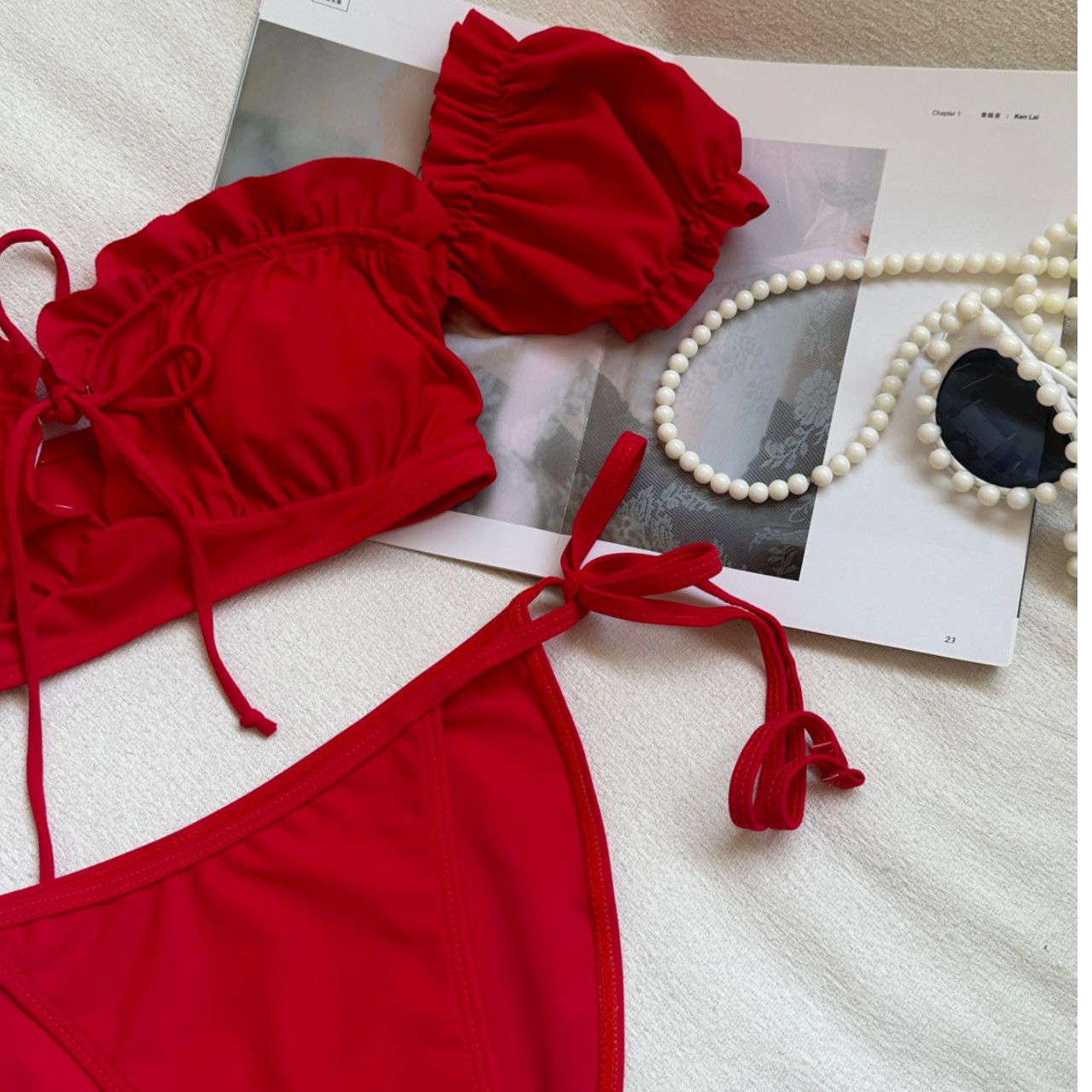 omom冯提莫同款 性感复古红色比基尼分体泳衣女有胸垫纯欲2455 新款