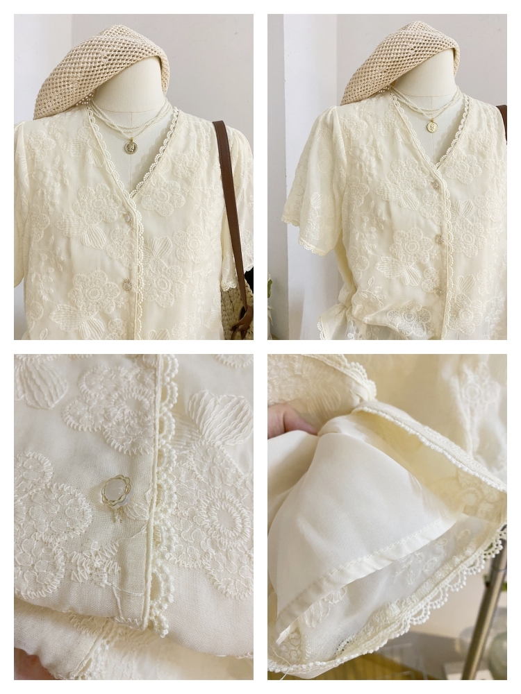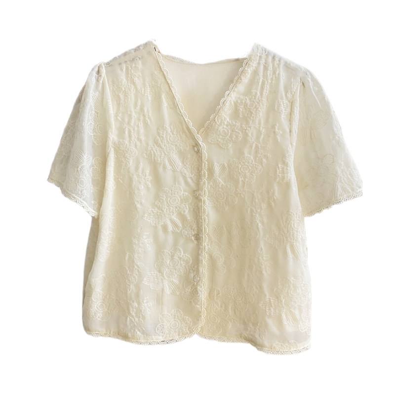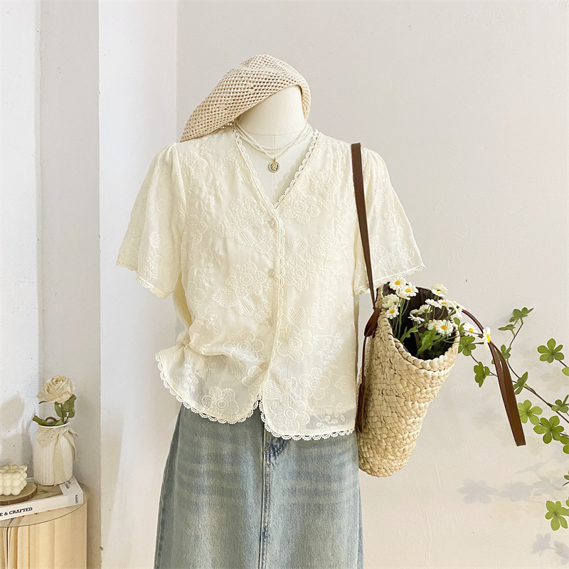 温柔减龄韩系刺绣小衫 法式 女2025夏短款 衬衫 上衣 气质花边V领短袖