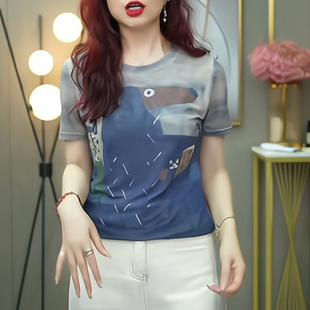 T恤女上衣修身 2025夏季 百搭圆领短袖 时尚 显瘦印花气质网纱t恤 新款