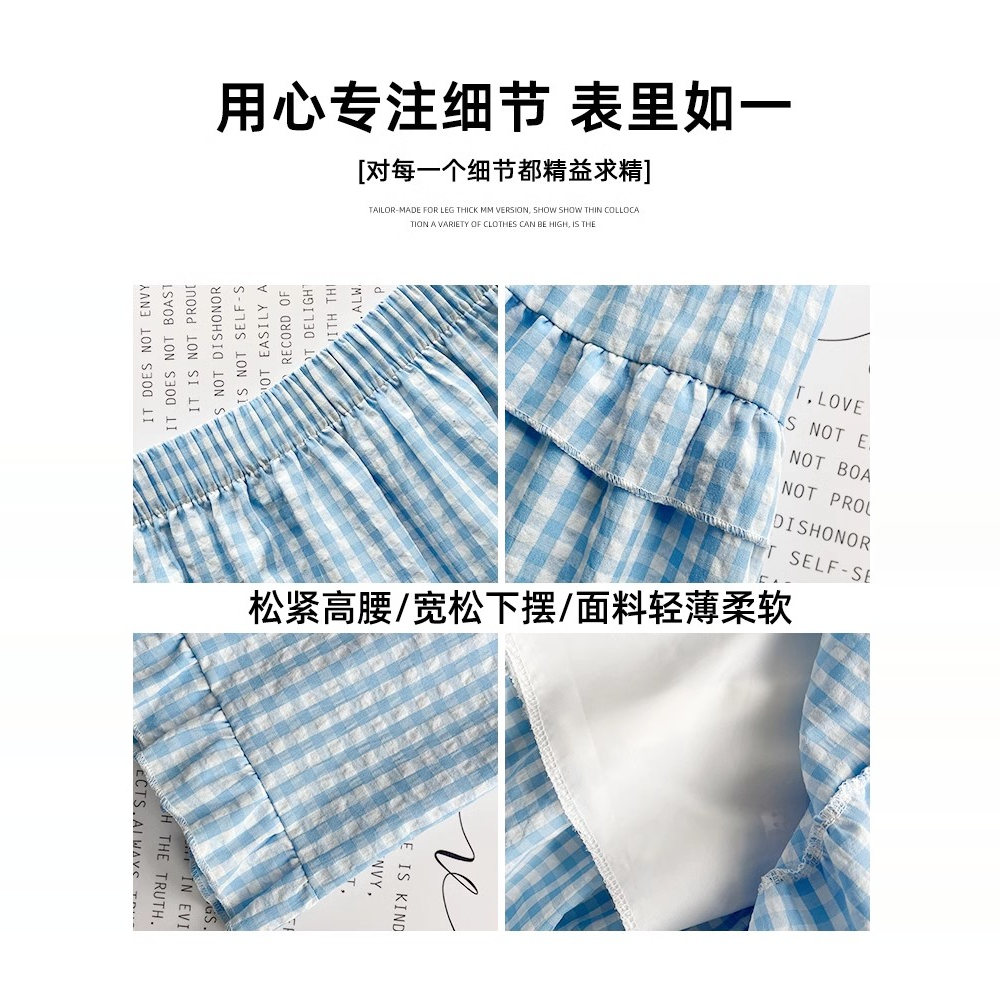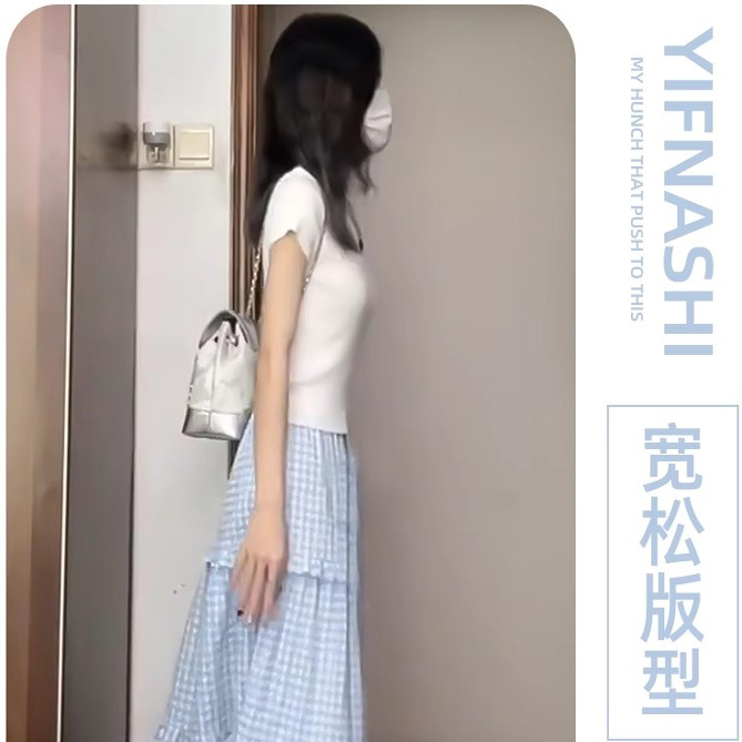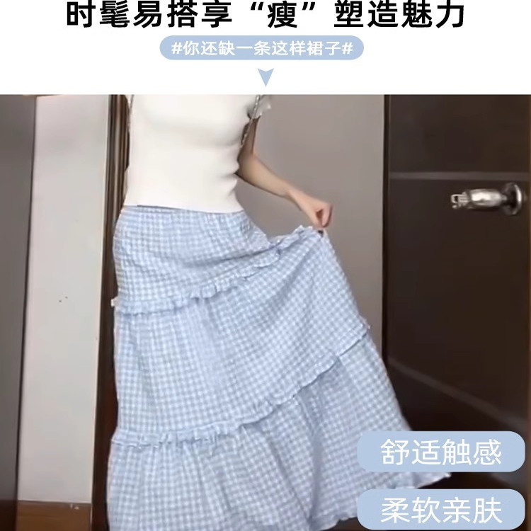 蓝白格子蛋糕裙女春夏季 a字裙高腰遮胯显瘦大摆伞裙半身裙 中长款
