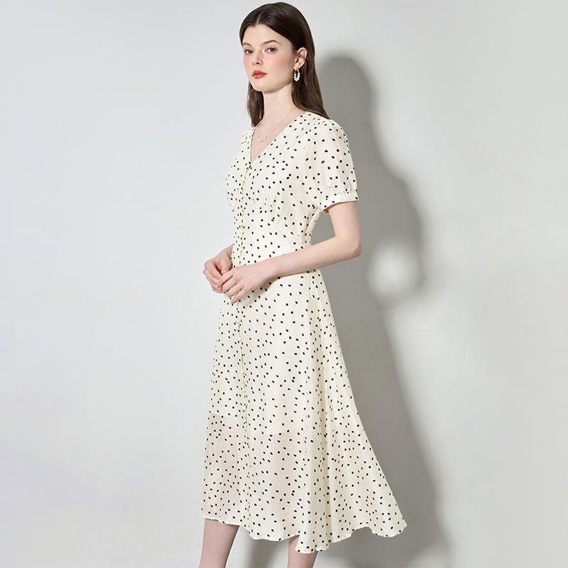 法式 新款 V领开叉女薄 连衣裙2025夏季 丝质亚麻收腰显瘦波点中长款