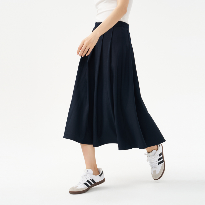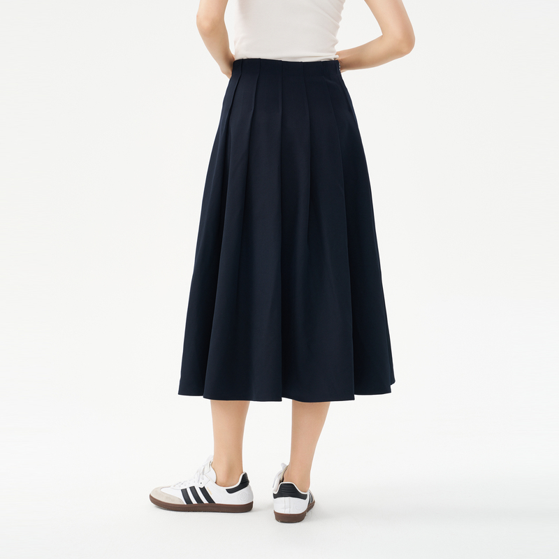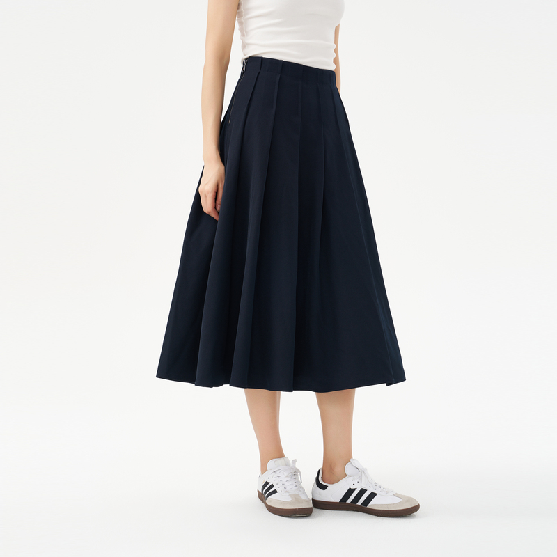 OTT春秋新款 不规则百褶裙藏蓝色简约腰裙 高腰A字半身裙女长款