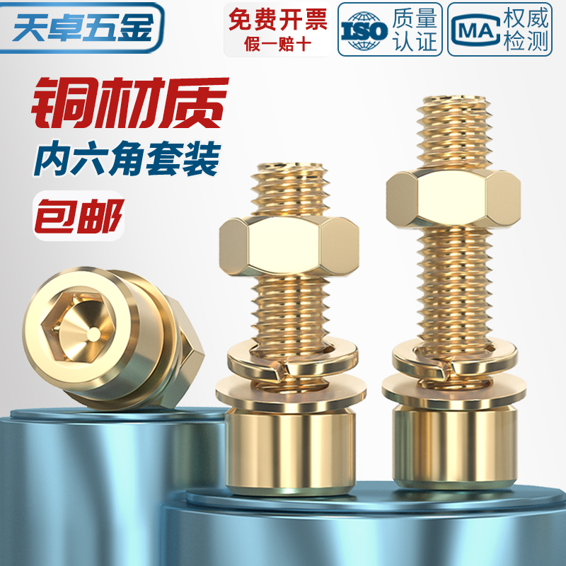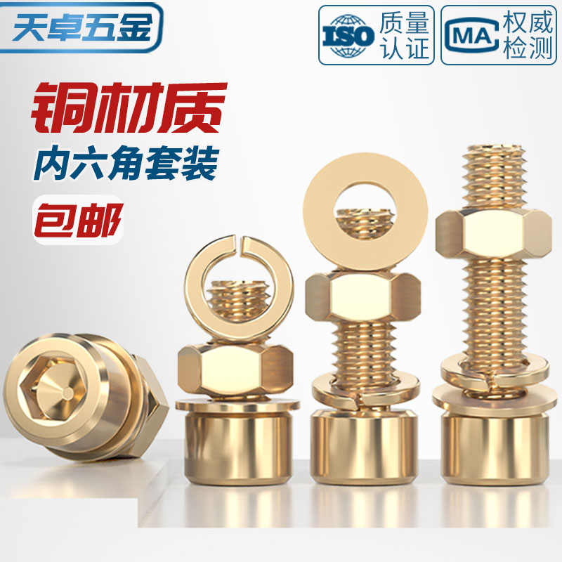 国标纯黄铜全铜内六角螺丝钉螺母螺栓螺帽平垫弹垫片垫圈套装 大全
