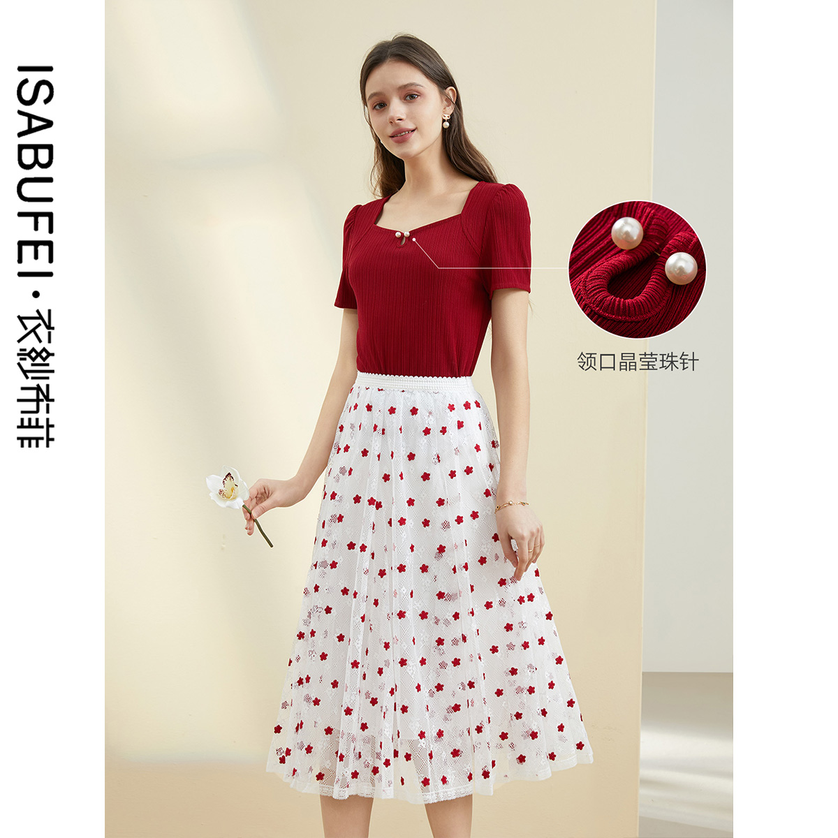 国风针织短袖 显瘦短款 t恤女新款 修身 红色上衣 夏季 纱布菲丹萱