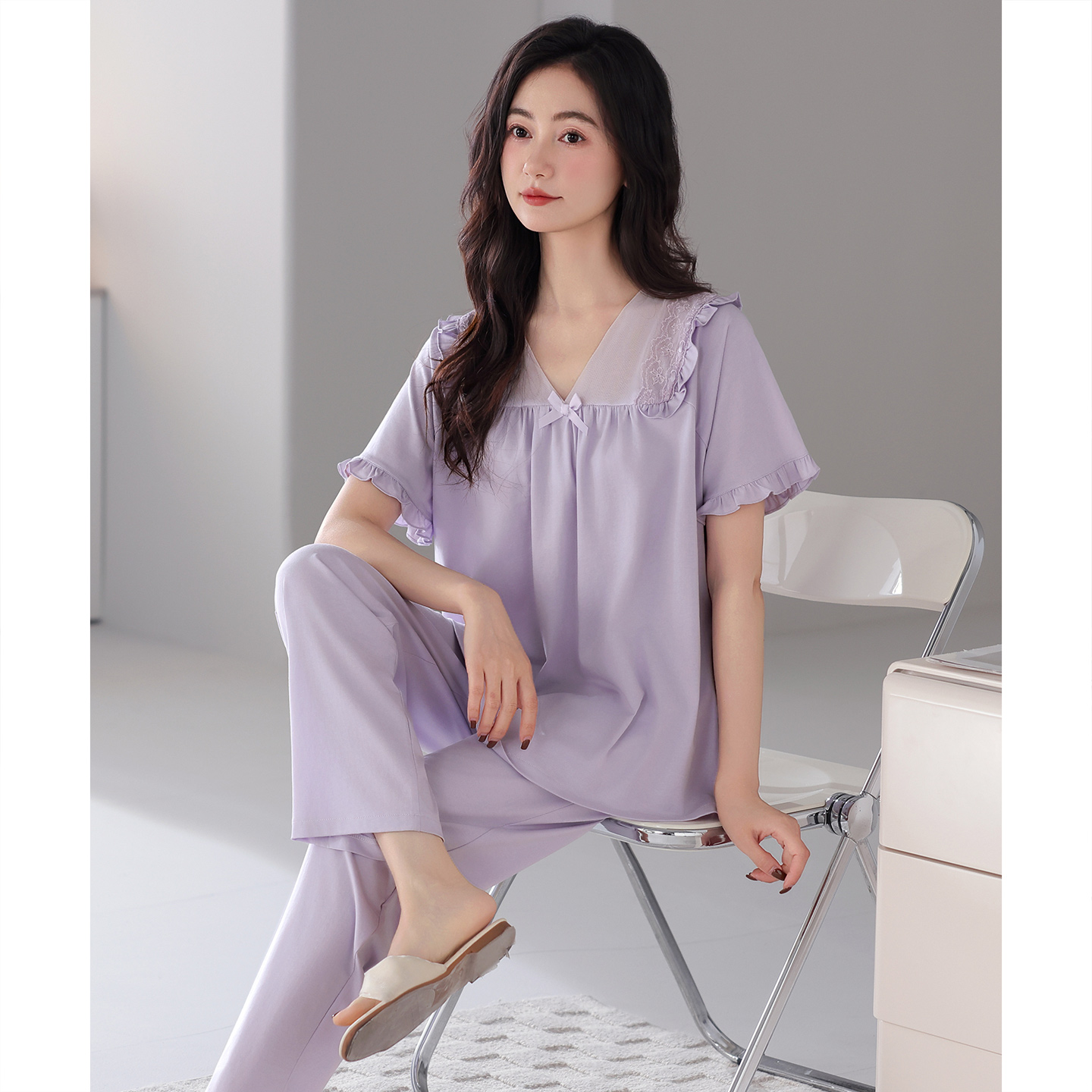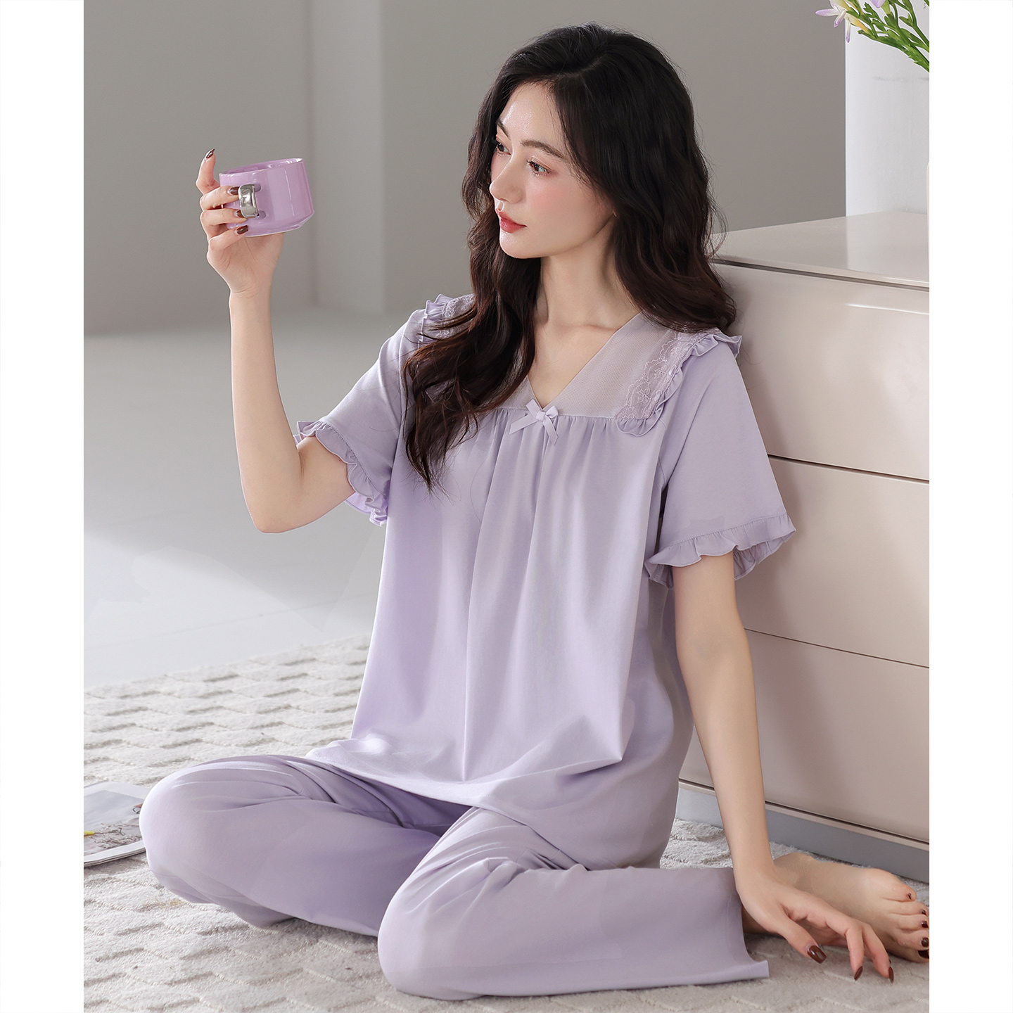 夏天中年妈妈高级感夏款 睡衣女士夏季 薄款 长裤 休闲家居服 纯棉短袖