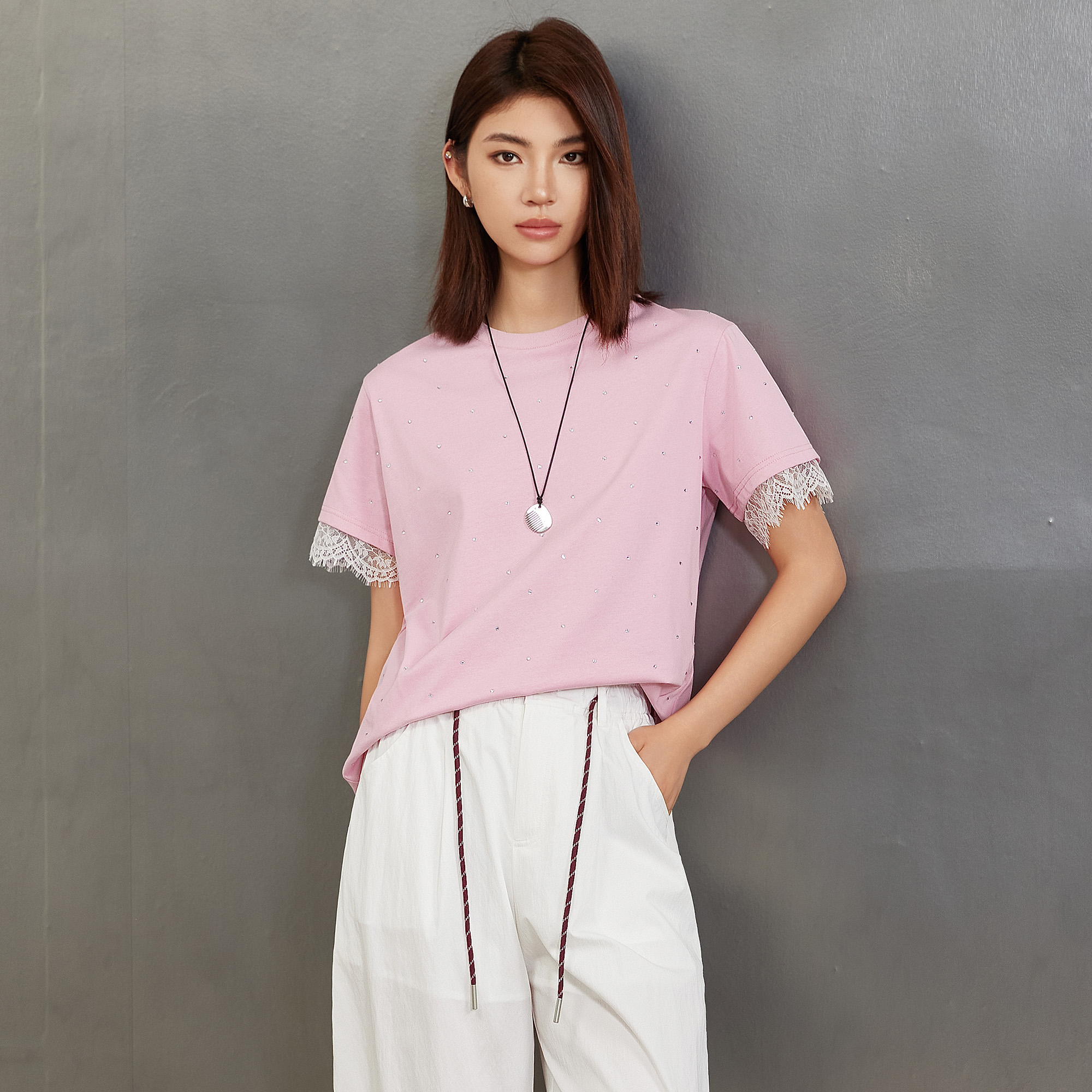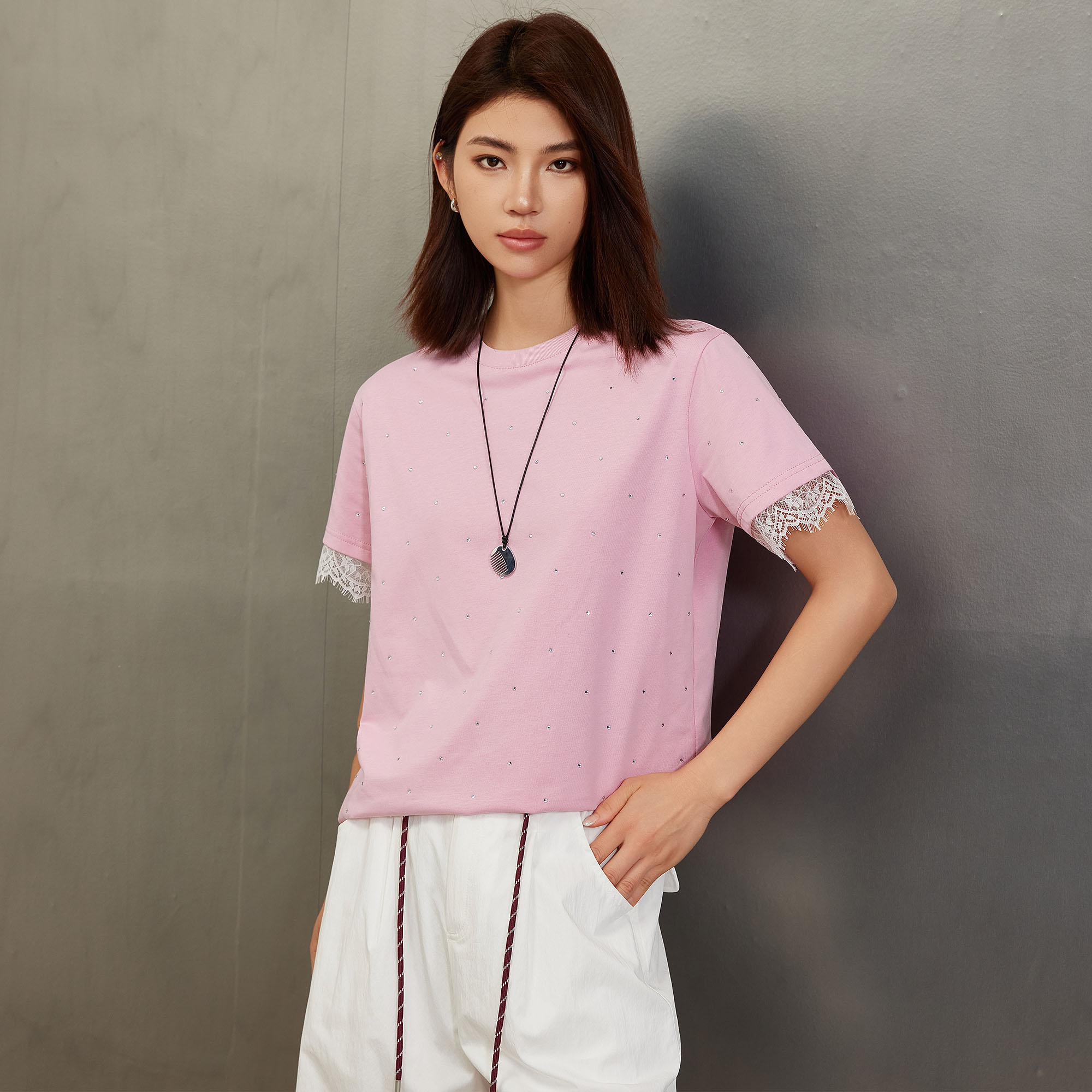 T恤女2025夏季 百家好减龄拼接蕾丝花边短袖 显瘦上衣 House Basic