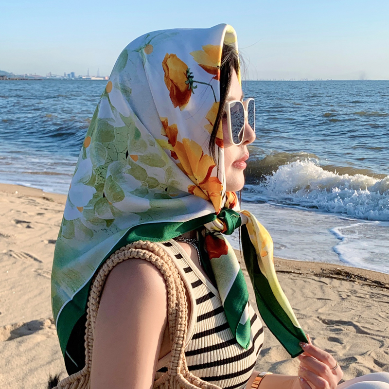 防晒披肩包头巾围巾发带搭配衬衫 绿色油画小方巾丝巾女士夏季 薄款