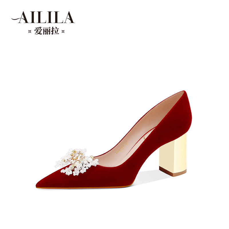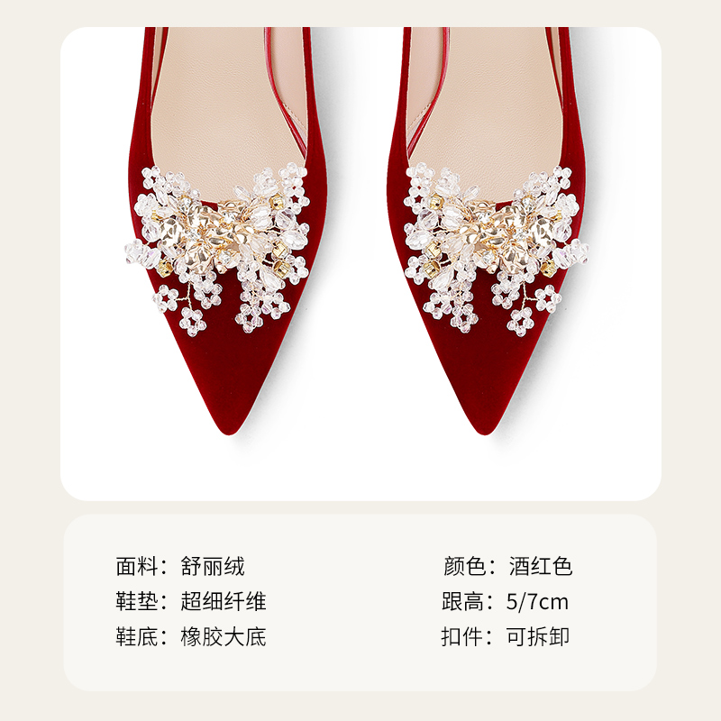 不累脚敬酒单鞋 秀禾新娘粗跟绒面高跟鞋 女新中式 爱丽拉酒红色婚鞋
