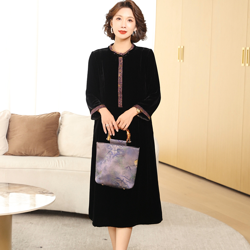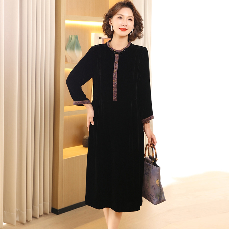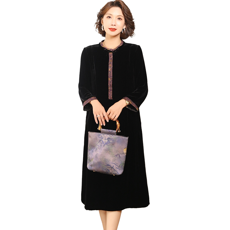 新款 妈妈高贵精致裙子气质春秋 复古真丝丝绒连衣裙女桑蚕丝新中式