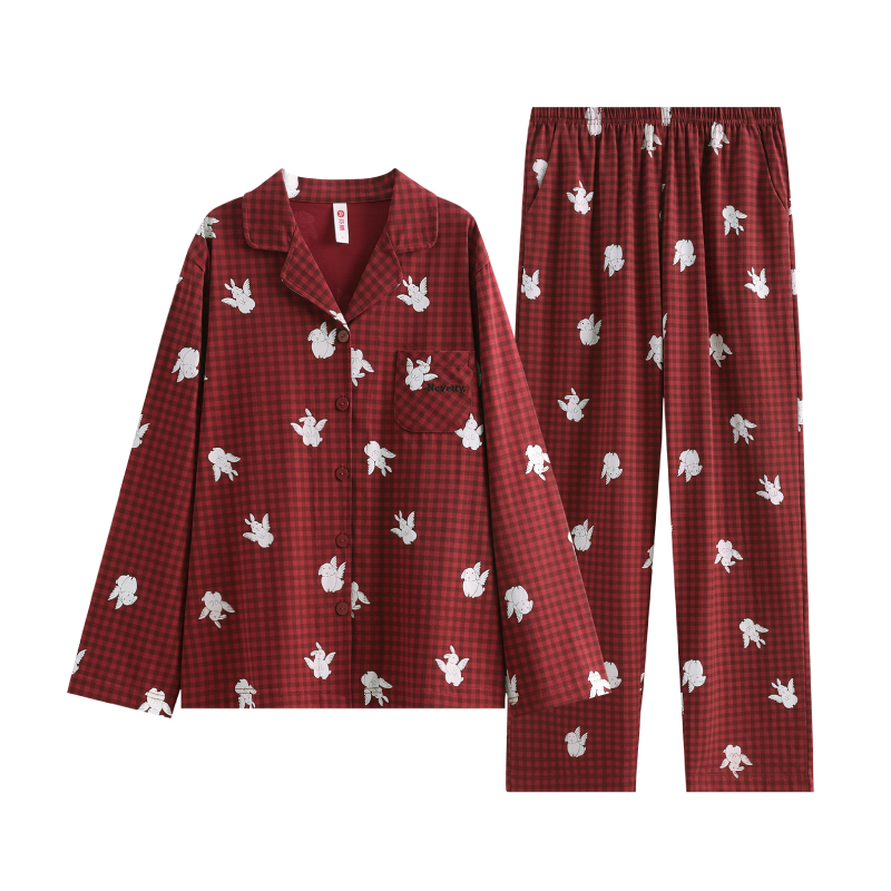 男春秋 带胸垫家居服套装 A类抗菌防螨纯棉情侣睡衣女长袖 红豆夏季