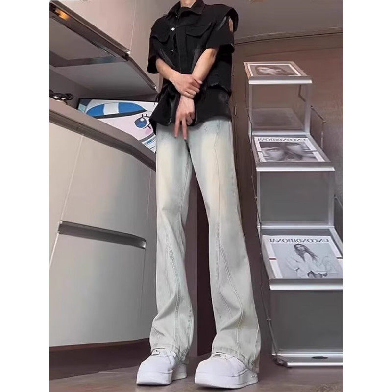 春秋复古显瘦直筒裤 子男款 高街vibe潮牌水洗做旧裤 黑色微喇牛仔裤