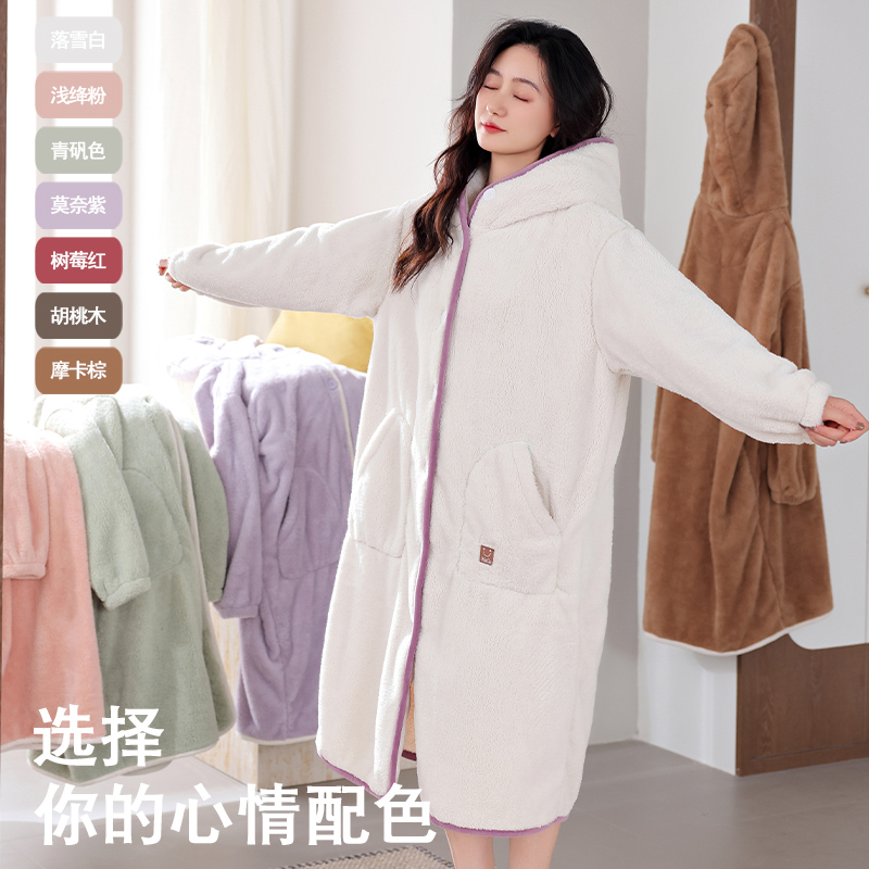 家居服睡衣 大码 睡袍女秋冬季 珊瑚绒加绒加厚连帽浴袍晨袍保暖长款