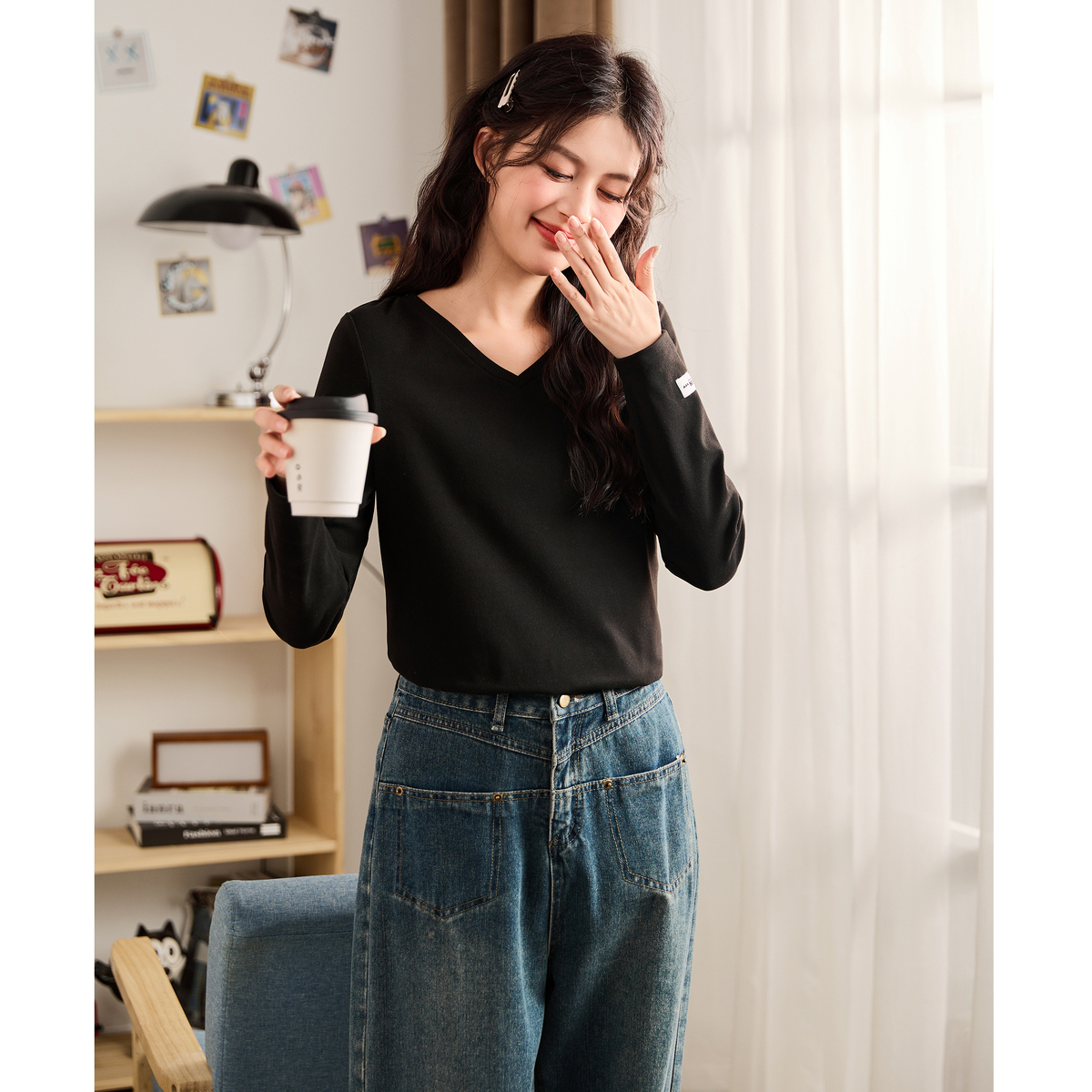 圆领加绒V领内搭春装 唐狮2025新款 白色春季 女加厚长袖 净色 打底衫
