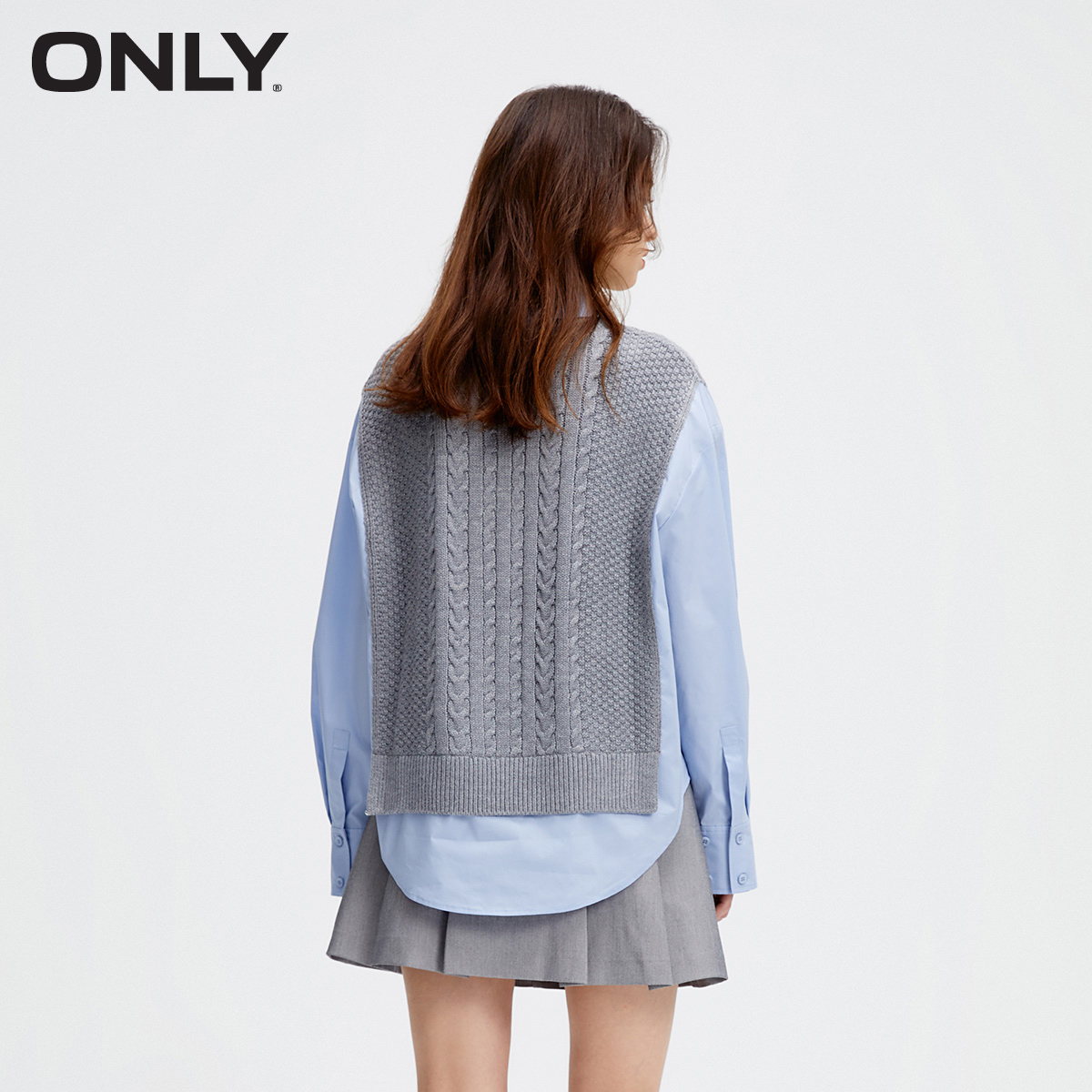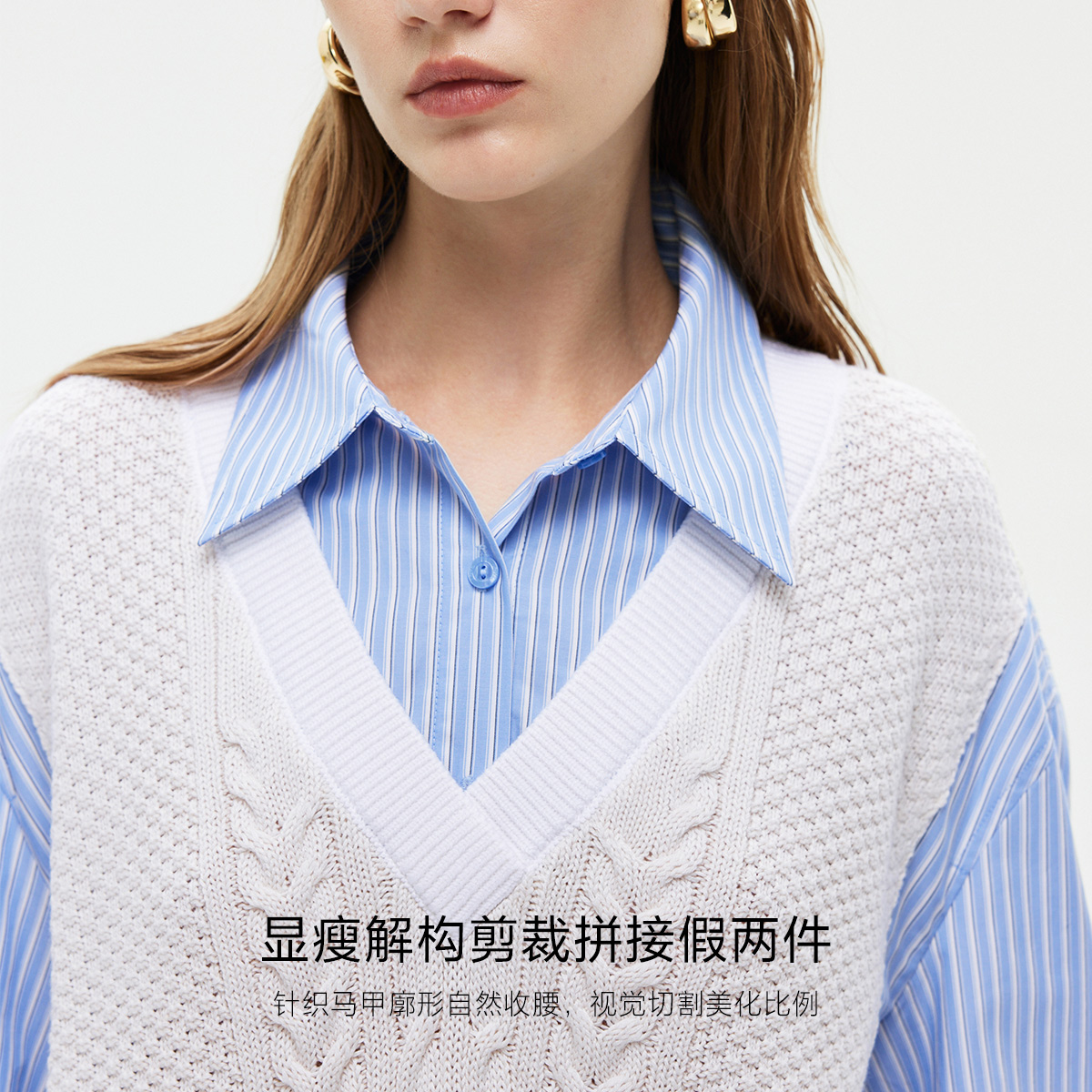 ONLY学院风洋气简约宽松翻领拼接长袖 女 假两件马甲针织衬衫