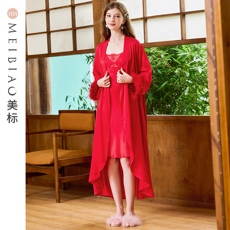 乐姿梦春秋季 男女新娘晨袍吊带睡裙 冰丝红色睡衣结婚新婚情侣套装